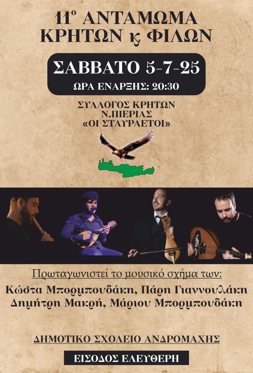 Το 11ο Αντάμωμα Κρητών και Φίλων διοργανώνει το Σάββατο 05 Ιουλίου στις 20:30 στο δημοτικό σχολείο Ανδρομάχης, ο Σύλλογος Κρητών Ν.Πιερίας «ΟΙ ΣΤΑΥΡΑΕΤΟΙ».