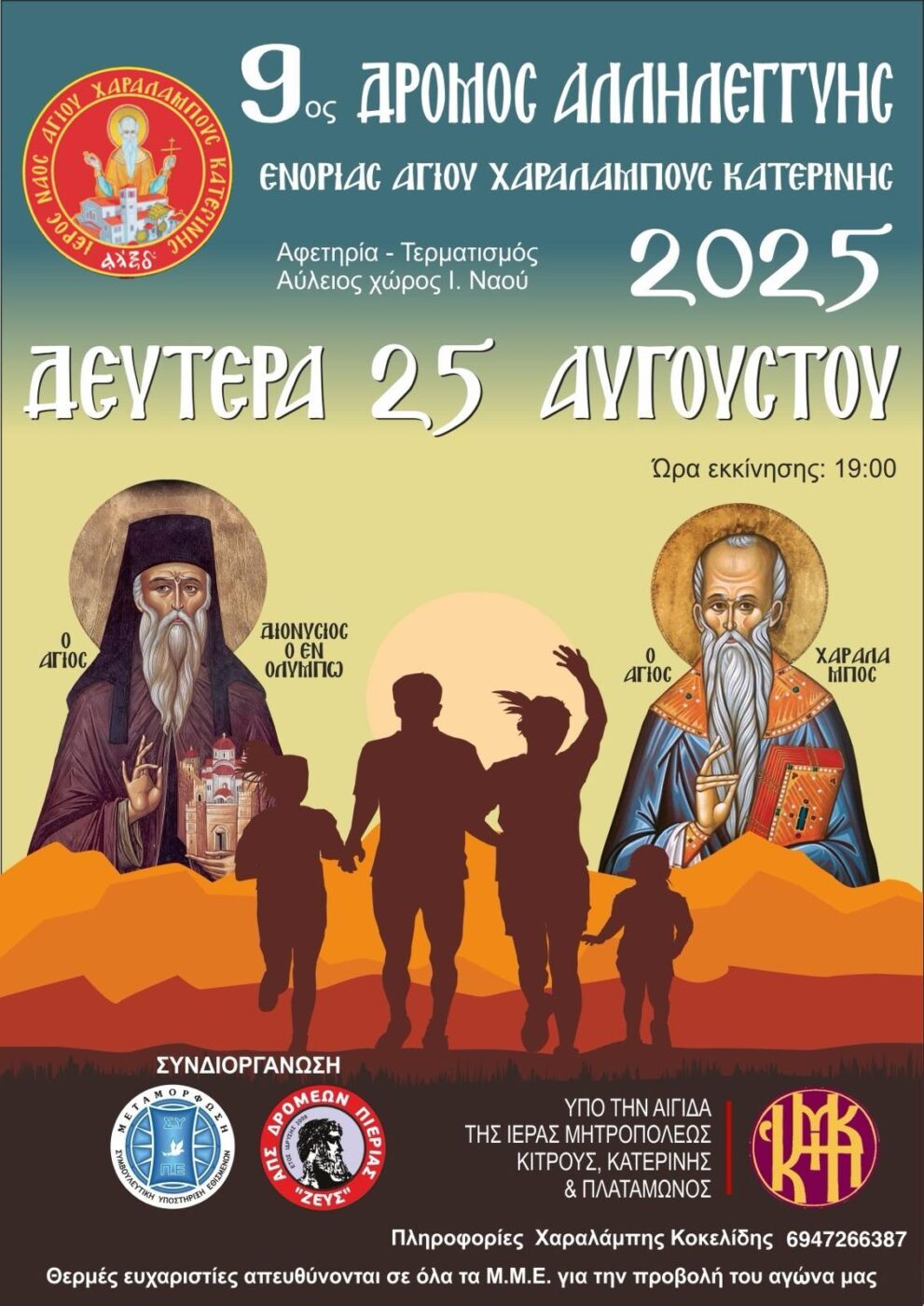 Ο Ιερός Ναός Αγίου Χαραλάμπους Κατερίνης, η Συμβουλευτική Υποστήριξη Εθισμένων (Σ.Υ.Π.Ε) «Μεταμόρφωση» και ο Αθλητικός Πολιτιστικός Σύλλογος Δρομέων Ν. Πιερίας «ΖΕΥΣ» διοργανώνουν και προκηρύσσουν τον 9ο Αγώνα Δρόμου Αλληλεγγύης συνολικής απόστασης 5.000 μ. ο οποίος διεξάγεται εντός των ορίων της ενορίας.