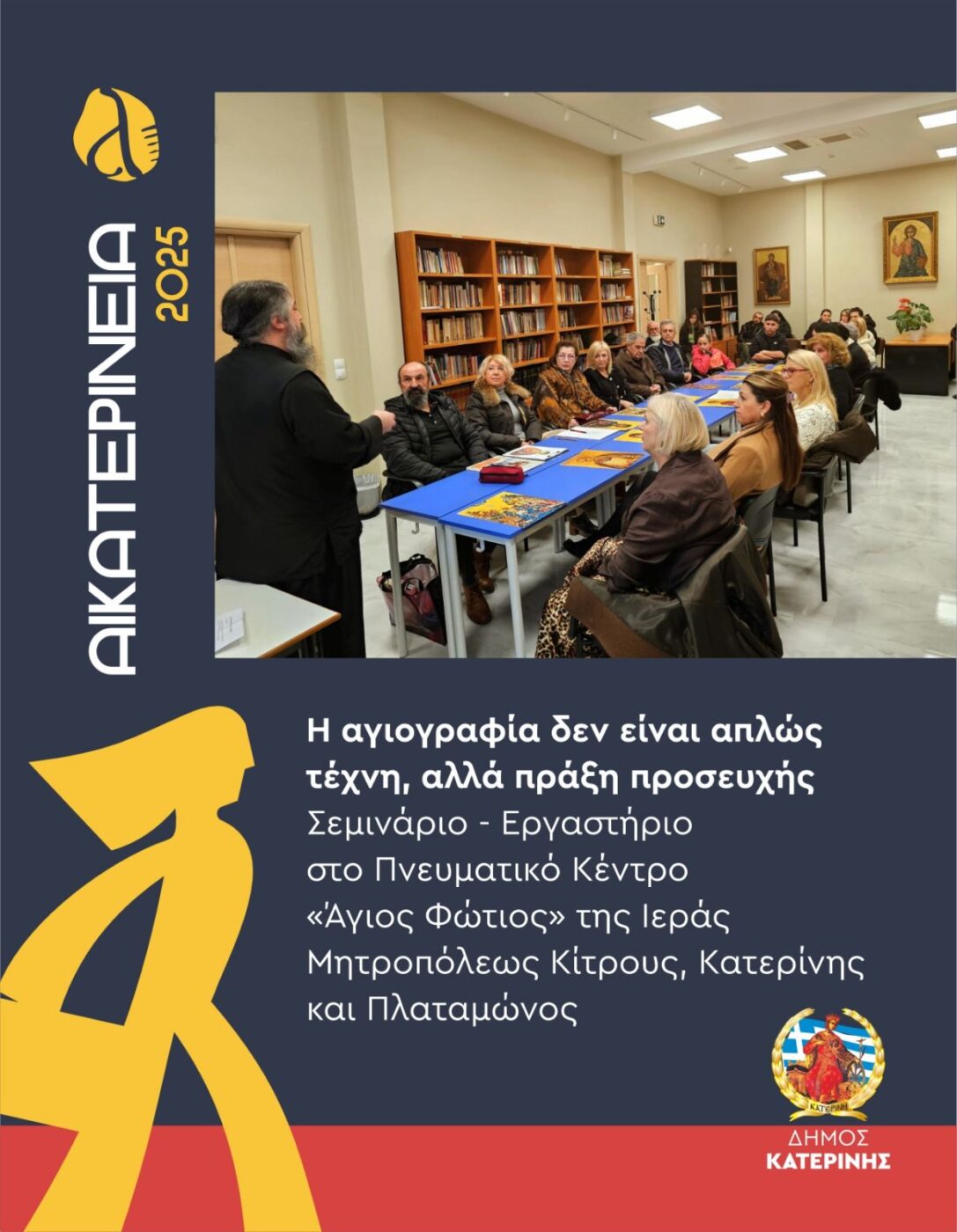 Η ενταγμένη στα φετινά Αικατερίνεια εκδήλωση, η οποία φιλοξενήθηκε στο Πνευματικό Κέντρο «Άγιος Φώτιος» της Ιεράς Μητροπόλεως Κίτρους γνώρισε θετική ανταπόκριση. Με εισηγητή τον Ιερέα – Αγιογράφο π. Θεόδωρο Κουστιάνη, επιβεβαίωσε το ενδιαφέρον για την πλούσια βυζαντινή παράδοση και την αξία της διατήρησής της.