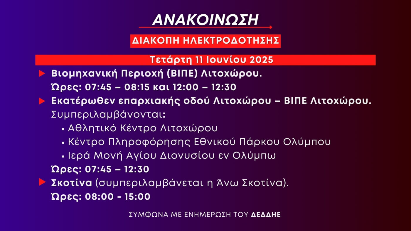 Ανακοίνωση: Προγραμματισμένες διακοπές ηλεκτροδότησης την Τετάρτη 11 Ιουνίου στη Βιομηχανική Περιοχή Λιτοχώρου και Πέμπτη 12 Ιουνίου στην Κοινότητα Σκοτίνας
