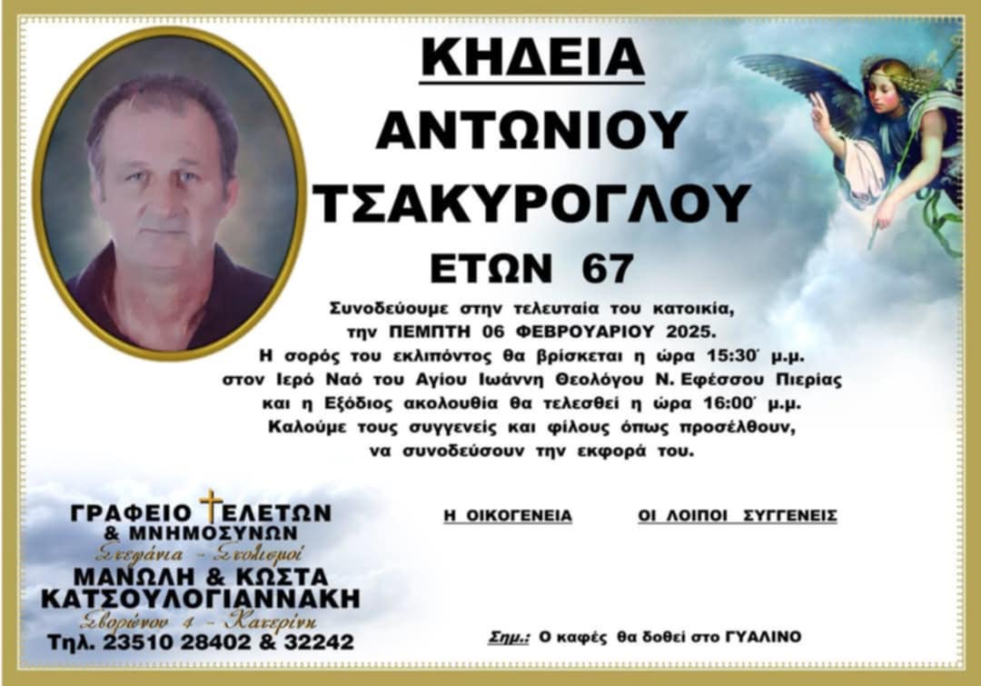 Τη θλίψη σκόρπισε σε συγγενείς, γνωστούς και φίλους η είδηση του θανάτου του Αντώνη Τσακύρογλου, σε ηλικία 67 ετών. Η κηδεία του θα γίνει αύριο, Πέμπτη 6 Φεβρουαρίου και ώρα 16:00 μ.μ. Η νεκρώσιμος ακολουθία θα τελεστεί στον Ιερό Ναό Αγίου Ιωάννου του Θεολόγου στη Νέα Έφεσο.