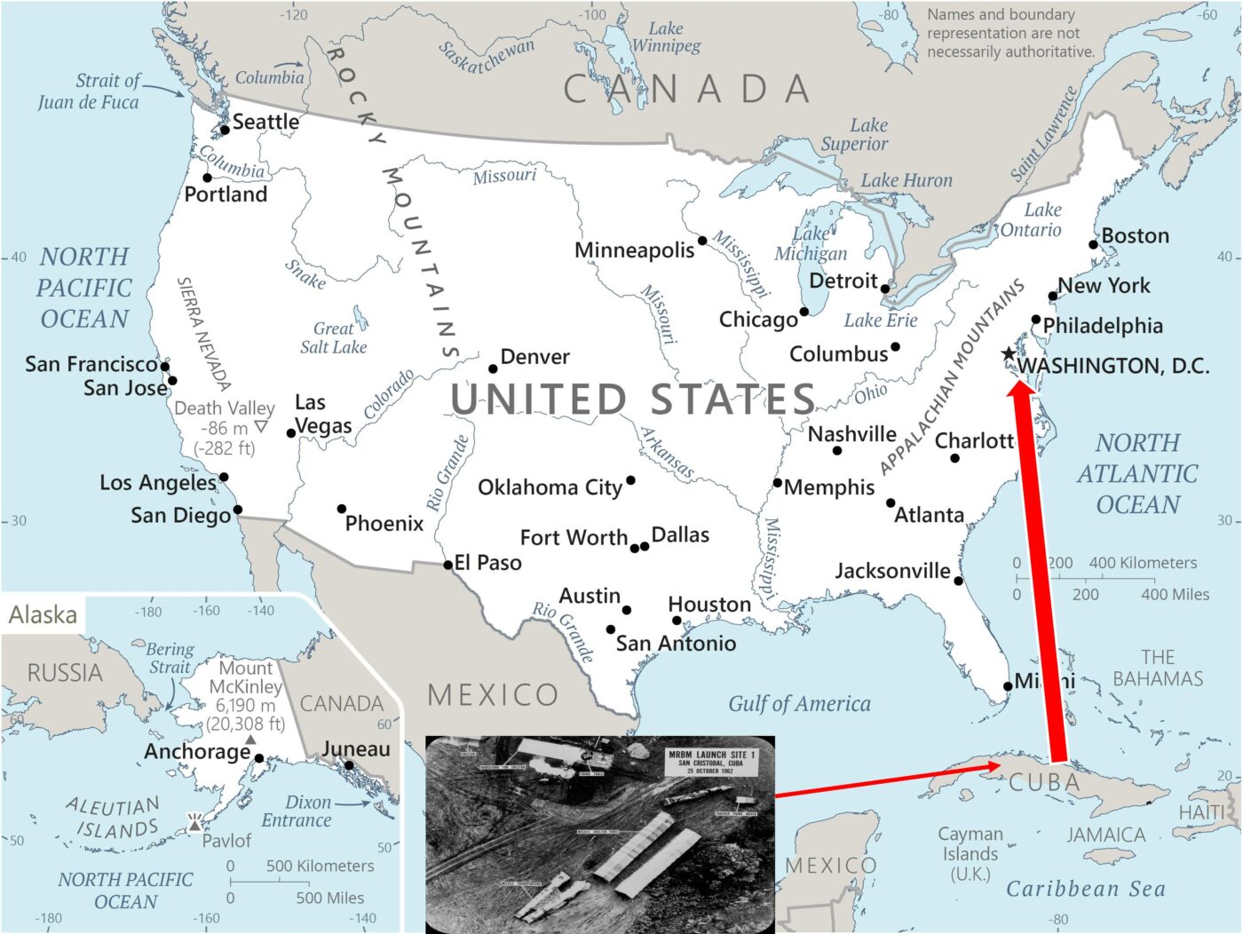 Ας μεταφερθούμε όμως σε έναν άλλο χάρτη, αυτήν την φορά στις ΗΠΑ και στο όχι τόσο μακρινό 1962. Βρισκόμαστε στην περίοδο του ψυχρού πολέμου μεταξύ του τότε Συμφώνου της Βαρσοβίας και του ΝΑΤΟ. Η Σοβιετική Ένωση αποφασίζει να εγκαταστήσει μυστικά στην Κούβα του Φιντέλ Κάστροβαλλιστικούς πυρηνικούς πυραύλους μέσου βεληνεκούς (MRBMs και IRBMs). Οι ΗΠΑ ανακαλύπτουν την ενέργεια αυτή και ο τότε ΠρόεδροςJohn Kennedy θέτει τελεσίγραφο στην Σοβιετική Ένωση του NikitaKhrushchev για άμεση απόσυρση των πυραύλων, διαφορετικά θα ενεργούσε στρατιωτικά για την καταστροφή τους. Τελικά η κρίση έληξε, αφού οι Σοβιετικοί απέσυραν τους πυραύλους από την «αυλή των ΗΠΑ», θεωρώντας ότι εάν δεν το έκαναν, η κλιμάκωση θα ήταν απροσδιόριστηκαι σίγουρακαταστροφική. Σε εκείνη την περίπτωση η απόσταση των Σοβιετικών πυραύλων από την πρωτεύουσα των ΗΠΑ Ουάσιγκτον ήταν 1.800 χλμ.