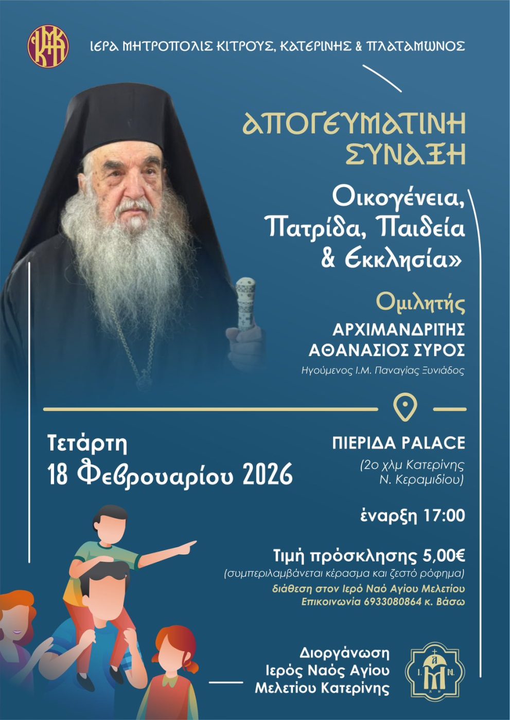 «Οικογένεια, πατρίδα, παιδεία και Εκκλησία» είναι το θέμα εκδήλωσης που διοργανώνει η Διαχειριστική Επιτροπή του Ιερού Ναού Αγίου Μελετίου Κατερίνης. Ομιλητής, ο αρχιμανδρίτης Αθανάσιος Σύρος.