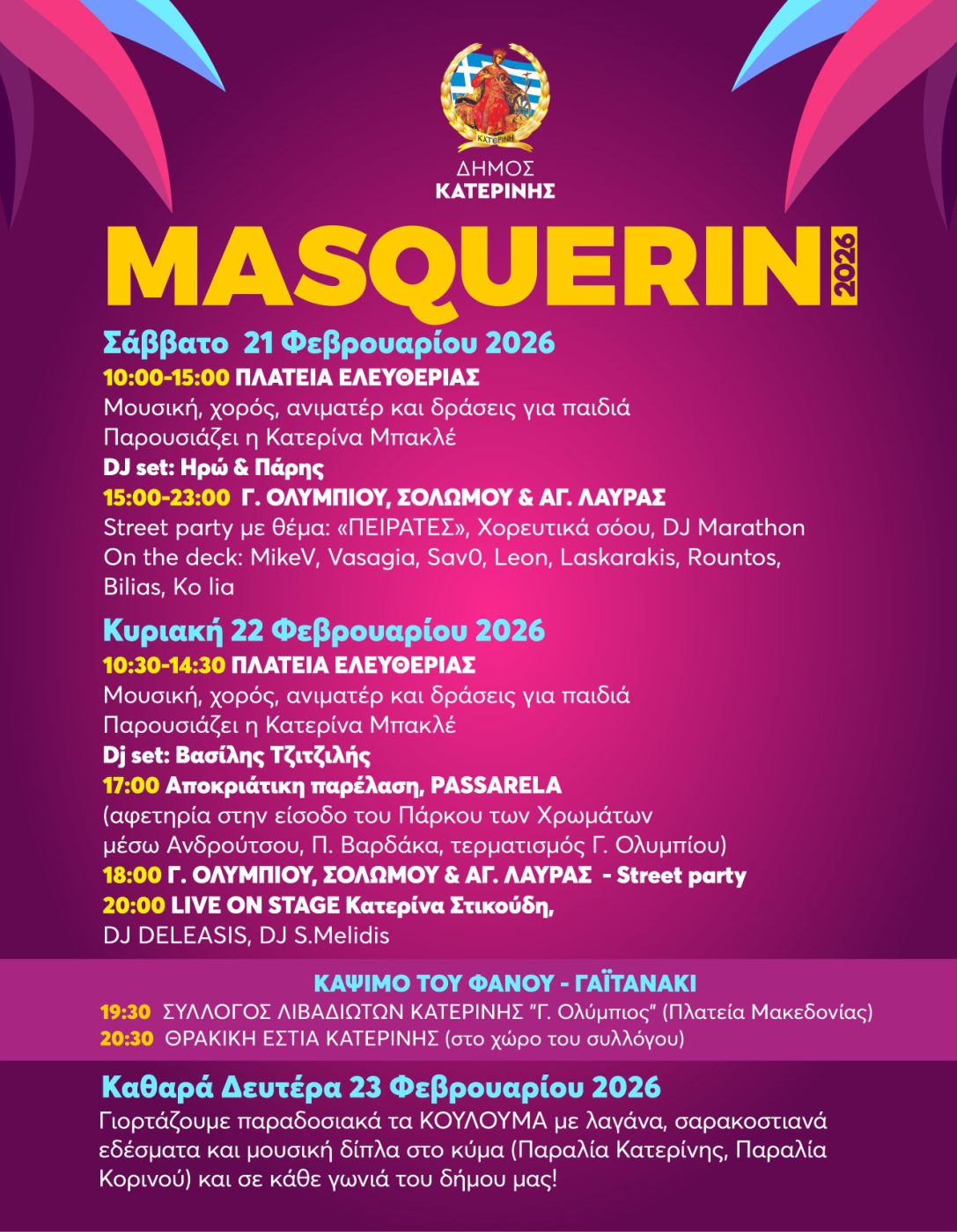 Απόκριες στην Κατερίνη – Masquerini 2026 I Αναλυτικό πρόγραμμα εκδηλώσεων