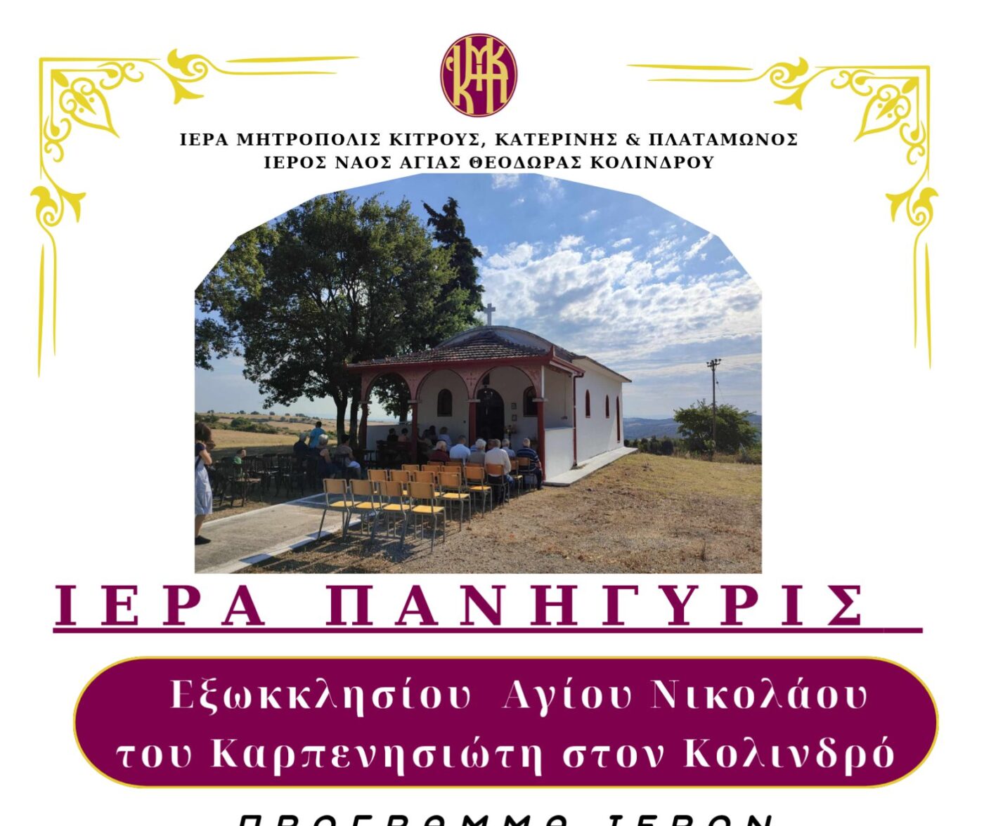 Μεγαλοπρεπώς θα εορταστεί και φέτος στον Κολινδρό η μνήμη της Αγίας Θεοδώρας εν Αλεξάνδρειας, από τις 10 έως τις 14 Σεπτεμβρίου 2025, με επίκεντρο την υποδοχή του Ιερού Λειψάνου του...