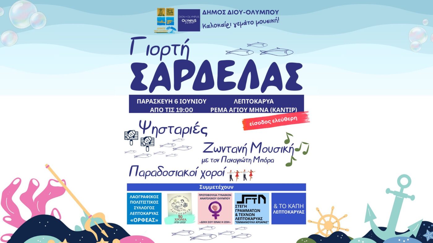 Ο Δήμος Δίου-Ολύμπου σας προσκαλεί την Παρασκευή 6 Ιουνίου 2025, από τις 7 μμ, στην «Γιορτή Σαρδέλας», που θα πραγματοποιηθεί στη Λεπτοκαρυά, ρέμα Αγίου Μηνά (Καντίρ). Το σήμα εκκίνησης του...
