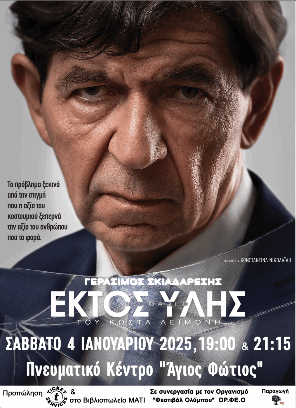 Με την παράσταση «Εκτός ύλης reloaded» του Κώστα Λεϊμονή, ενός έργου που σκιαγραφεί τη διαχρονική παθογένεια της ελληνικής πολιτικής σκηνής, συνεχίζονται οι «Χειμωνιάτικες Ψηφίδες Πολιτισμού» του Οργανισμού Φεστιβάλ Ολύμπου.