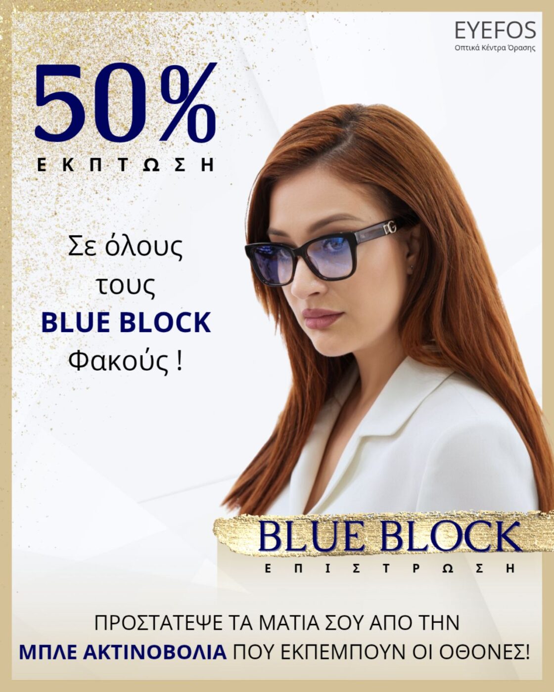Προστατέψτε τα μάτια σας από την μπλε ακτινοβολία με φακούς επίστρωσης Blue Block που θα τους βρείτε για όλο τον μήνα Δεκέμβριο, στα οπτικά καταστήματα Eyefos, με έκπτωση -50%!