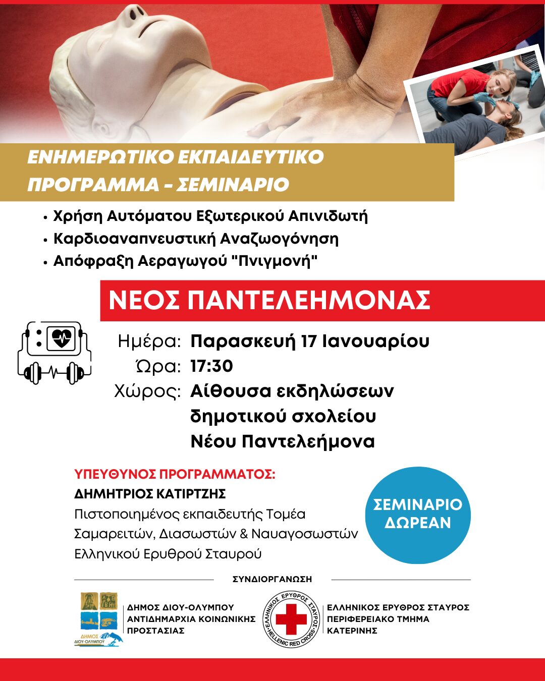 Δήμος Δίου-Ολύμπου: Σήμερα στο Νέο Παντελεήμονα το δωρεάν ενημερωτικό-εκπαιδευτικό σεμινάριο χρήσης απινιδωτή, απόφραξης αεραγωγού «Πνιγμονή» και καρδιοαναπνευστικής αναζωογόνησης
