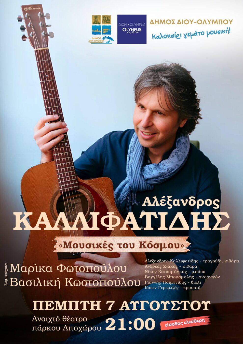 Ο Δήμος Δίου-Ολύμπου σας προσκαλεί σε ένα συναυλιακό ταξίδι γεμάτο «Μουσικές του Κόσμου», ερμηνευμένες από τον Αλέξανδρο Καλλιφατίδη την Πέμπτη 7 Αυγούστου 2025 στις 9 το βράδυ στο ανοιχτό θέατρο του δημοτικού πάρκου Λιτοχώρου.