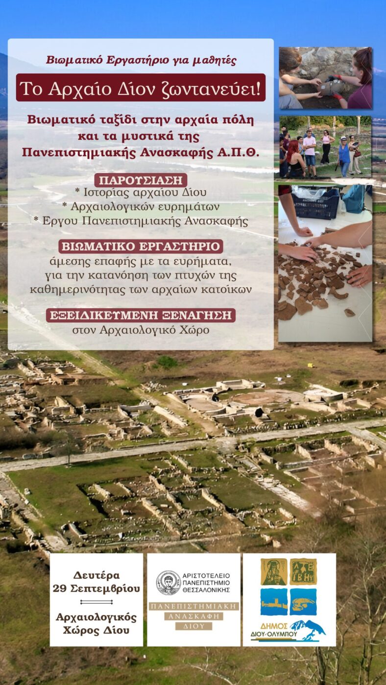 Σε ένα βιωματικό ταξίδι στην αρχαία πόλη του Δίου και τα μυστικά της Πανεπιστημιακής Ανασκαφής του Αριστοτελείου Πανεπιστημίου Θεσσαλονίκης θα έχουν την ευκαιρία να συμμετέχουν μαθητές του Γυμνασίου Κονταριώτισσας, τη Δευτέρα 29 Σεπτεμβρίου 2025.