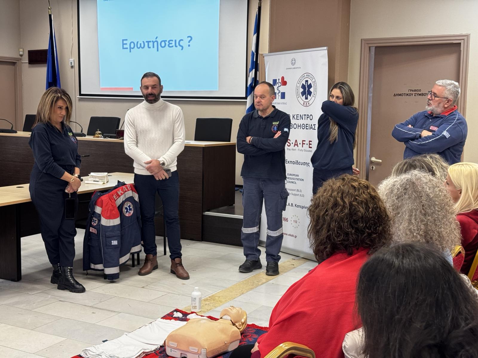 Το εκπαιδευτικό σεμινάριο διενεργήθηκε από διασώστες του ΕΚΑΒ Πιερίας, στην αίθουσα συνεδριάσεων του Δημοτικού Συμβουλίου, στο Δημαρχείο.