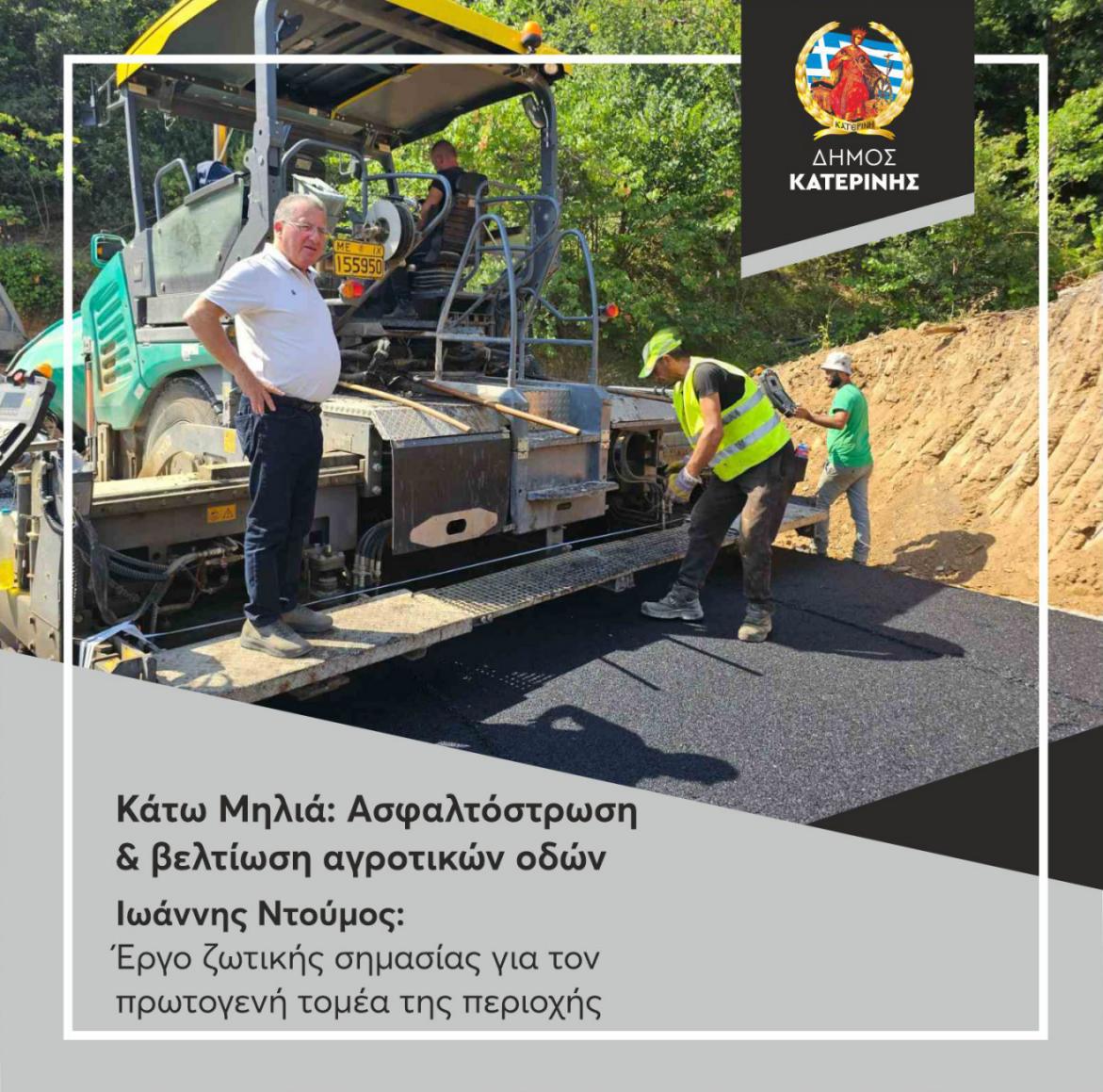 Με ταχείς ρυθμούς συνεχίζεται το έργο βελτίωσης του αγροτικού οδικού δικτύου του Δήμου Κατερίνης, με ασφαλτοστρώσεις που βρίσκονται σε εξέλιξη στην Κάτω Μηλιά. Το έργο, το οποίο εντάσσεται στο χρηματοδοτικό πρόγραμμα «Αντώνης Τρίτσης», συμβάλλει καθοριστικά στη βελτίωση της πρόσβασης προς αγροτικές και κτηνοτροφικές εκμεταλλεύσεις σε όλες τις Δημοτικές Ενότητες του Δήμου.