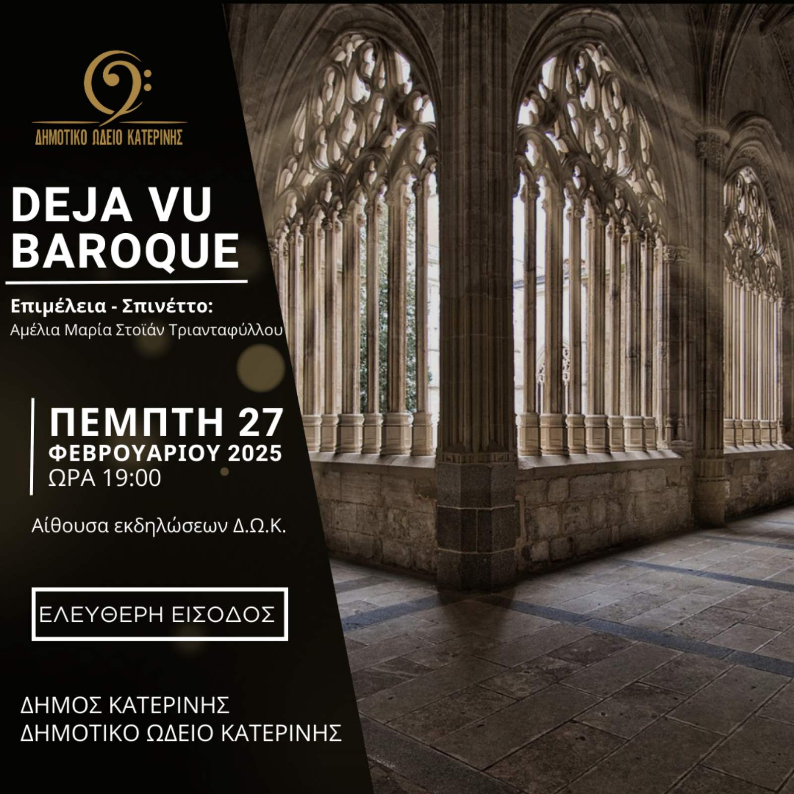 Την Πέμπτη 27 Φεβρουαρίου, ώρα 19:00 στο Δημοτικό Ωδείο Κατερίνης (αίθουσα εκδηλώσεων), θα πραγματοποιηθεί εκπαιδευτική – καλλιτεχνική παράσταση ανοιχτή στο κοινό με θέμα “Déjà vu Baroque: Εισαγωγή στο Μπαρόκ ρεπερτόριο για αρπίχορδο, βασισμένη στην ιστορία των πληκτροφόρων οργάνων της εποχής”.