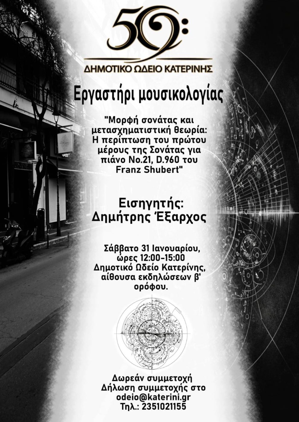 Στο πλαίσιο των εορταστικών εκδηλώσεων για τα 50 χρόνια προσφοράς του Δημοτικού Ωδείου Κατερίνης, το Σάββατο 31 Ιανουαρίου, ώρες 12:00 μ.- 15:00, θα πραγματοποιηθεί στο Δημοτικό Ωδείο Κατερίνης (αίθουσα β’ ορόφου) δωρεάν εργαστήρι μουσικολογίας από τον επίκουρο καθηγητή Μουσικολογίας του Πανεπιστημίου Ιωαννίνων, Δημήτρη Έξαρχο.