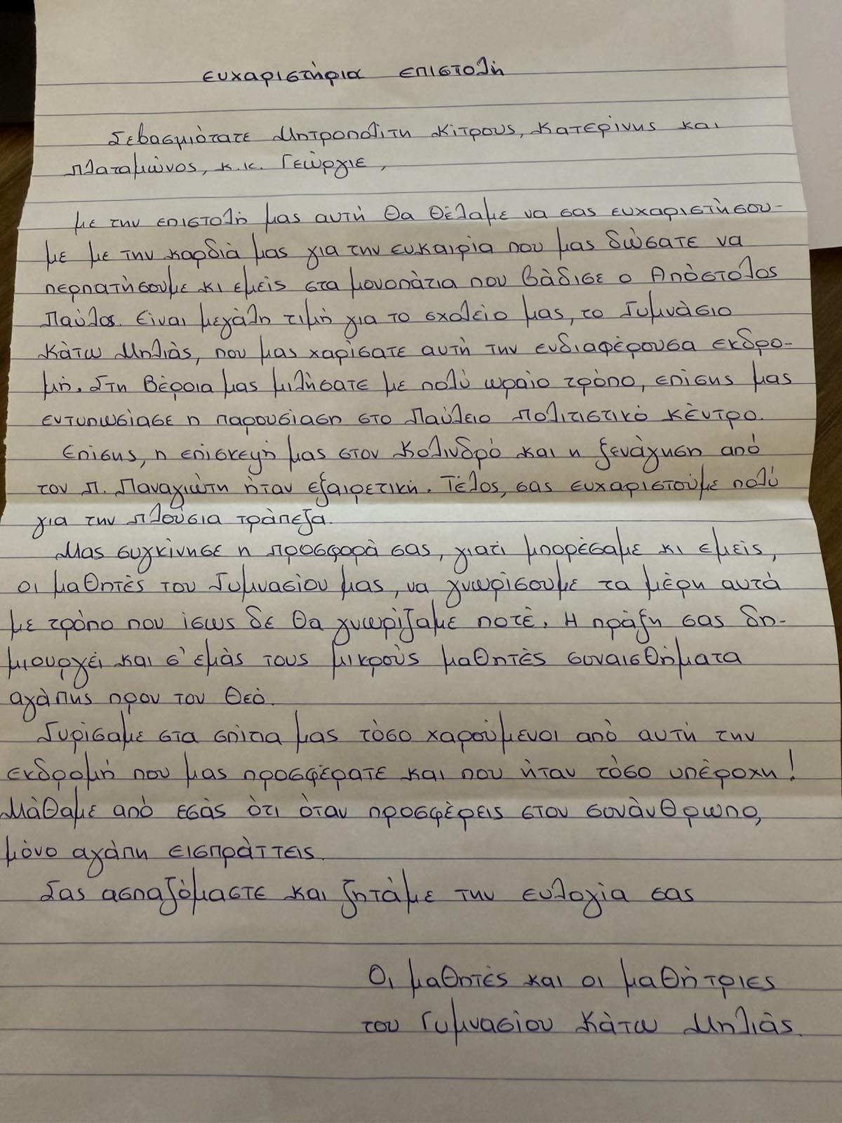 Ακολουθεί η ευχαριστήρια επιστολή των μαθητών του Γυμνασίου κ. Μηλιάς