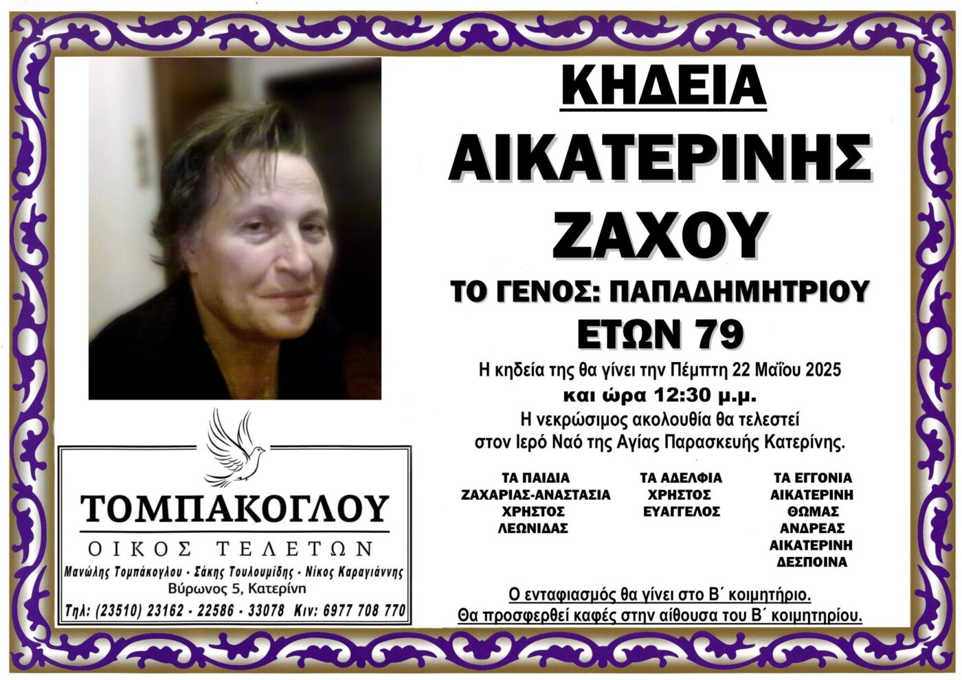Η κηδεία της θα γίνει αύριο Πέμπτη 22 Μαΐου και ώρα 12:30 μ.μ. στον Ιερό Ναό Αγίας Παρασκευής Κατερίνης.