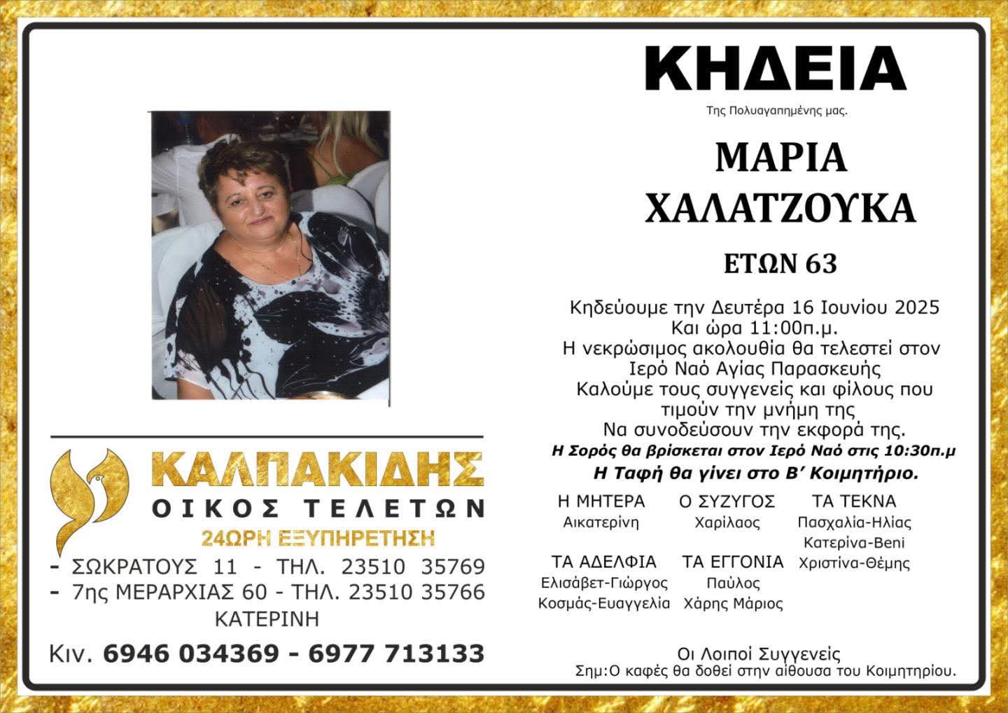 «Έφυγε» από τη ζωή, η Μαρία Χαλατζούκα σε ηλικία 63 ετών και σκόρπισε τη θλίψη σε συγγενείς και φίλους.