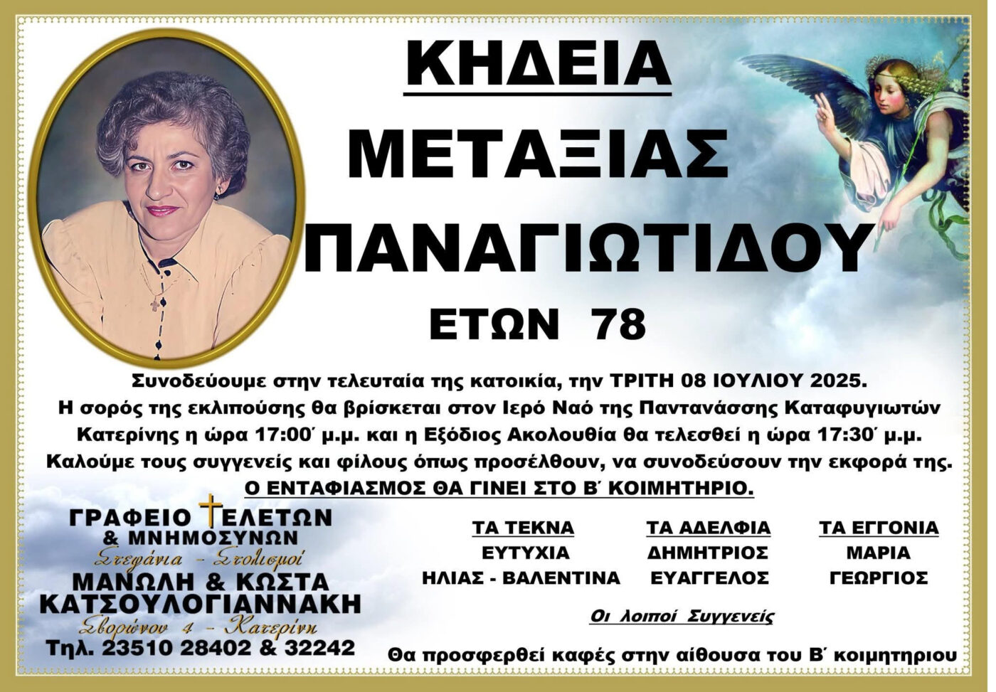 «Έφυγε» από τη ζωή, η Μεταξία Παναγιωτίδου σε ηλικία 78 ετών και σκόρπισε τη θλίψη σε συγγενείς και φίλους.