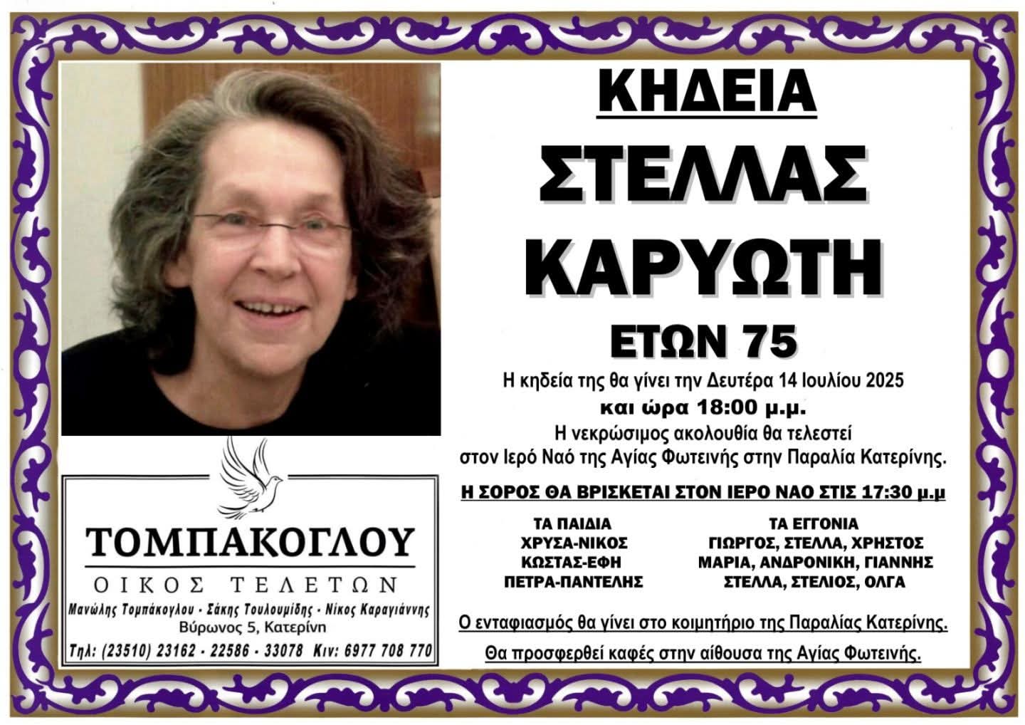 «Έφυγε» από τη ζωή η Στέλλα Καρυώτη, σε ηλικία 75 ετών, μητέρα του προέδρου του Ναυτικού Ομίλου Κατερίνης (ΝΟΚΑΤ), σκορπώντας τη θλίψη σε συγγενείς και φίλους. Η κηδεία της θα γίνει τη Δευτέρα 14 Ιουλίου και ώρα 18:00 μμ.