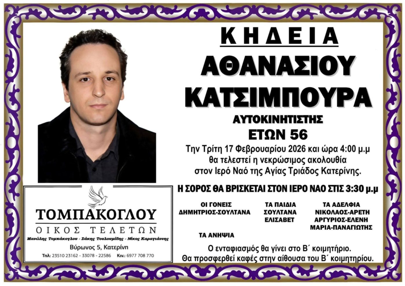 Η κηδεία του θα γίνει αύριο Τρίτη 17 Φεβρουαρίου και ώρα 16:00 στον Ιερό Ναό Αγίας Τριάδος Κατερίνης.