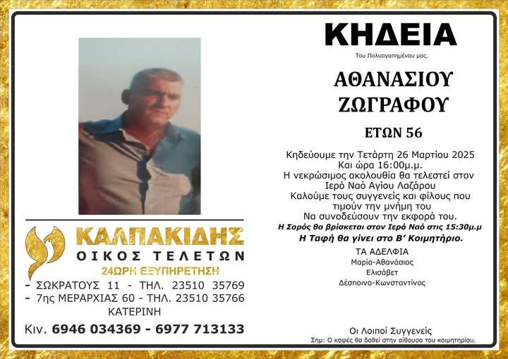 «Έφυγε» από τη ζωή, ο Αθανάσιος Ζωγράφου σε ηλικία 56 ετών και σκόρπισε τη θλίψη σε συγγενείς και φίλους.