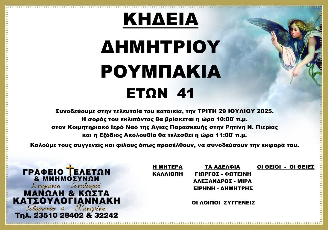 Η κηδεία του θα γίνει αύριο Τρίτη 29 Ιουλίου και ώρα 11:00 π.μ. στον Ιερό Ναό Αγίας Παρασκευής στην Ρητίνη Πιερίας.