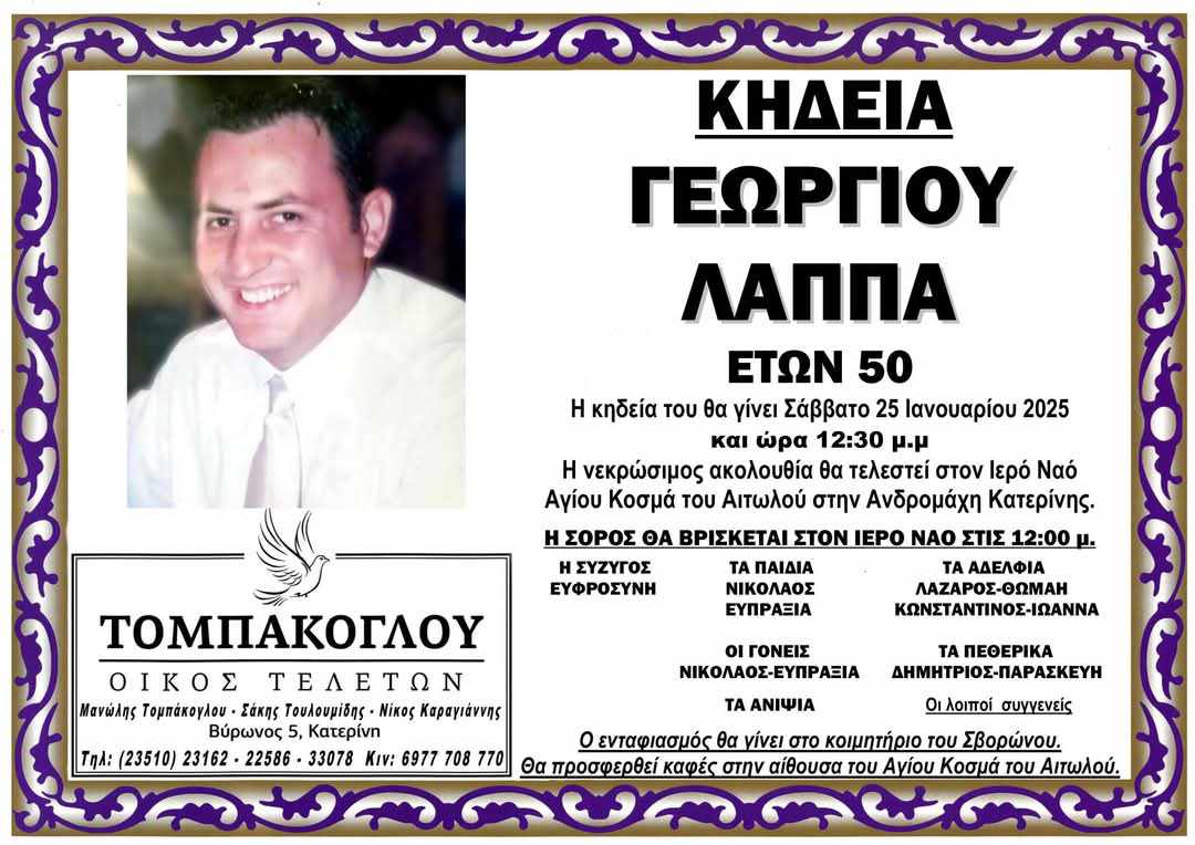 Η κηδεία του θα γίνει αύριο Σάββατο 25 Ιανουαρίου και ώρα 12:30 μ.μ. στον Ιερό Ναό Αγίου Κοσμά του Αιτωλού στην Ανδρομάχη Κατερίνης.