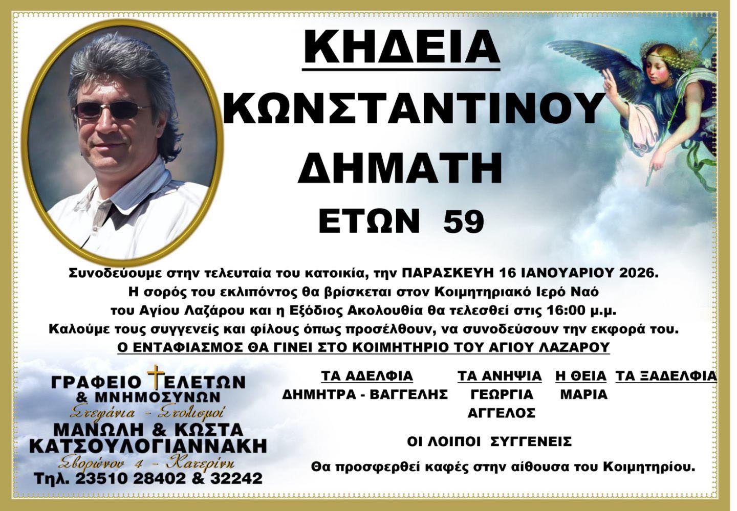 Η νεκρώσιμη τελετή θα τελεστεί την Παρασκευή 16 Ιανουαρίου στον Κοιμητηριακό Ιερό Ναό του Αγίου Λαζάρου Κατερίνης στις 16:00 μμ
