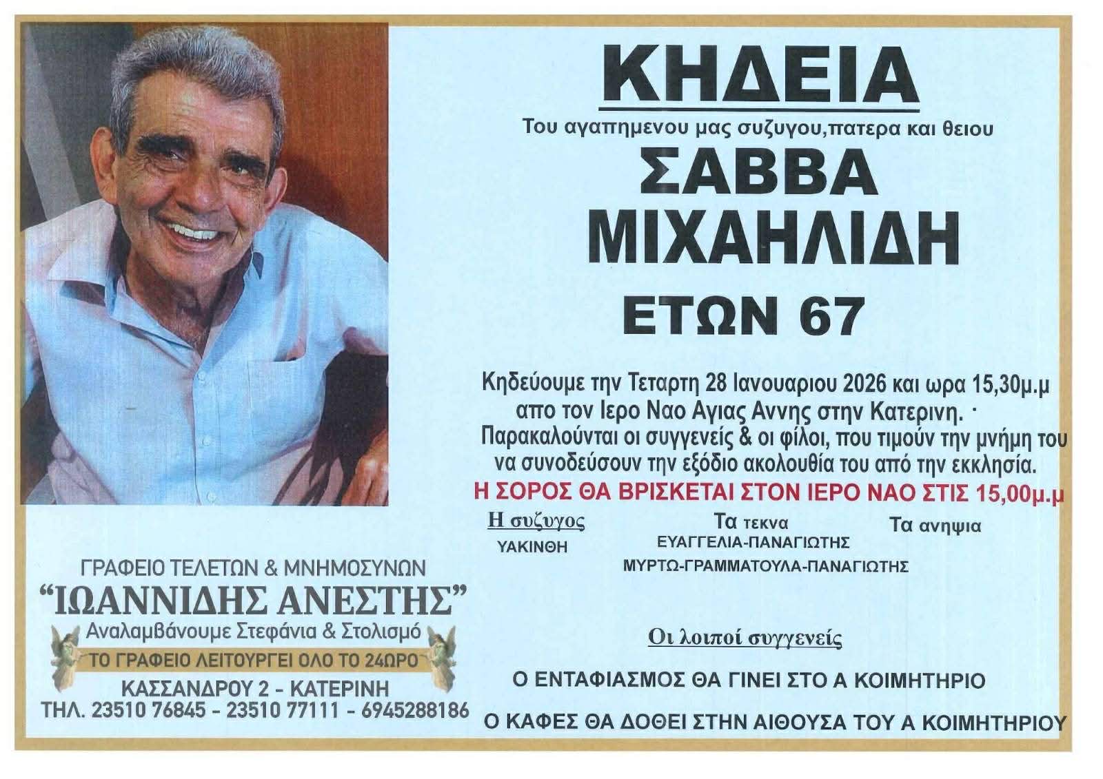 Η κηδεία του θα γίνει αύριο Τετάρτη 28 Ιανουαρίου και ώρα 15:30 μ.μ. στον Ιερό Ναό Αγίας Άννης στην Κατερίνη.