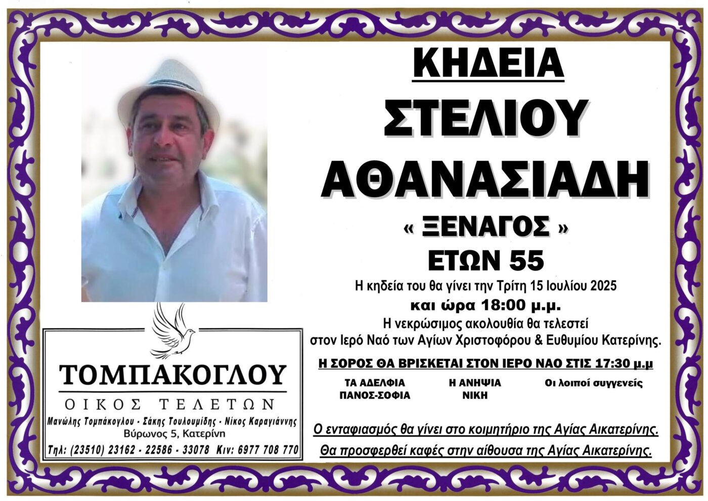 Η κηδεία του θα γίνει αύριο Τρίτη 15 Ιουλίου και ώρα 18:00 μ.μ. στον Ιερό Ναό Αγίου Χριστοφόρου & Ευθυμίου Κατερίνης