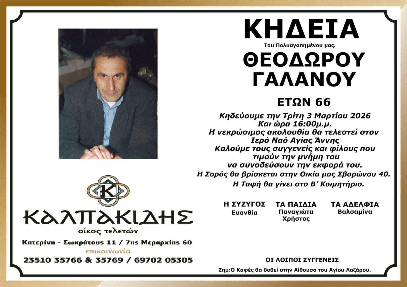 «Έφυγε» από τη ζωή, ο Θεόδωρος Γαλανός σε ηλικία 66 ετών και σκόρπισε τη θλίψη σε συγγενείς και φίλους.