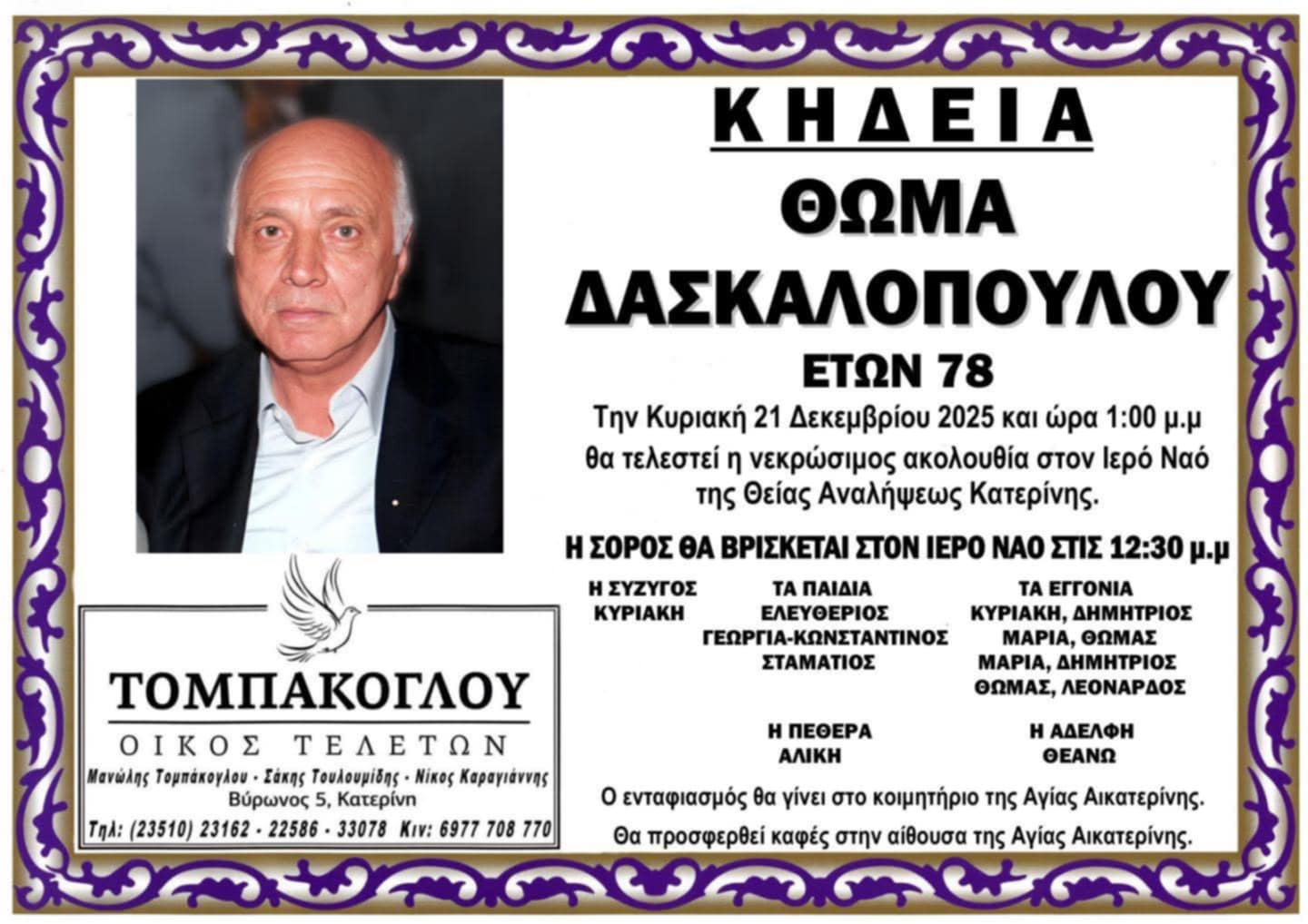 Η κηδεία του θα γίνει αύριο Κυριακή 21 Δεκεμβρίου και ώρα 13:00 μ.μ. στον Ιερό Ναό της Θείας Αναλήψεως Κατερίνης.