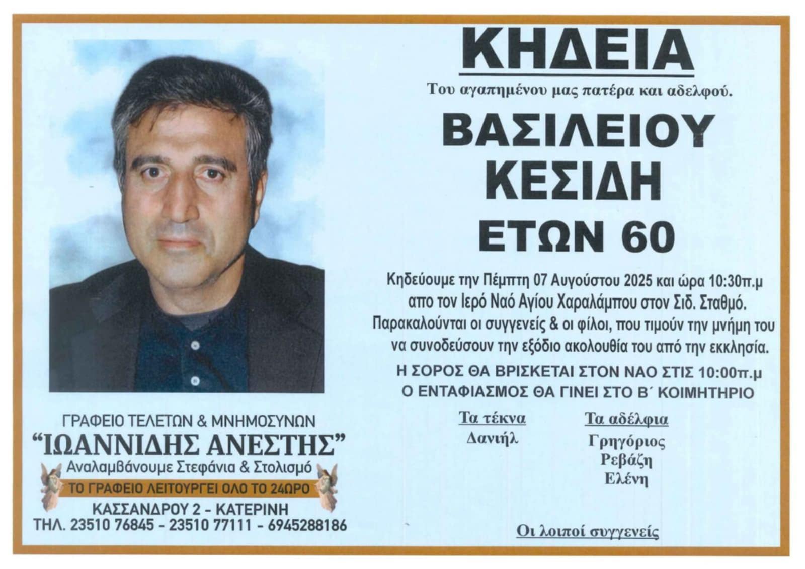 Η κηδεία του θα γίνει Πέμπτη 7 Αυγούστου και ώρα 10:30 π.μ. στον Ιερό Ναό Αγίου Χαραλάμπου στον Σιδ. Σταθμό.