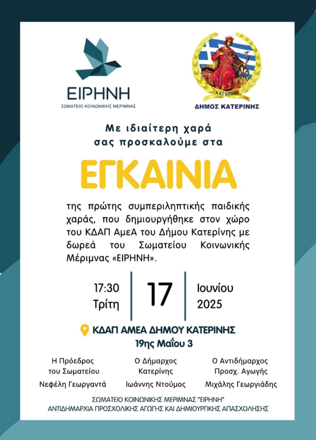 Την Τρίτη 17 Ιουνίου & ώρα 17:30 τα εγκαίνια της Πρώτης Συμπεριληπτικής Παιδικής Χαράς του Δήμου Κατερίνης (ΚΔΑΠ ΑμεΑ – 19ης Μαΐου 3)