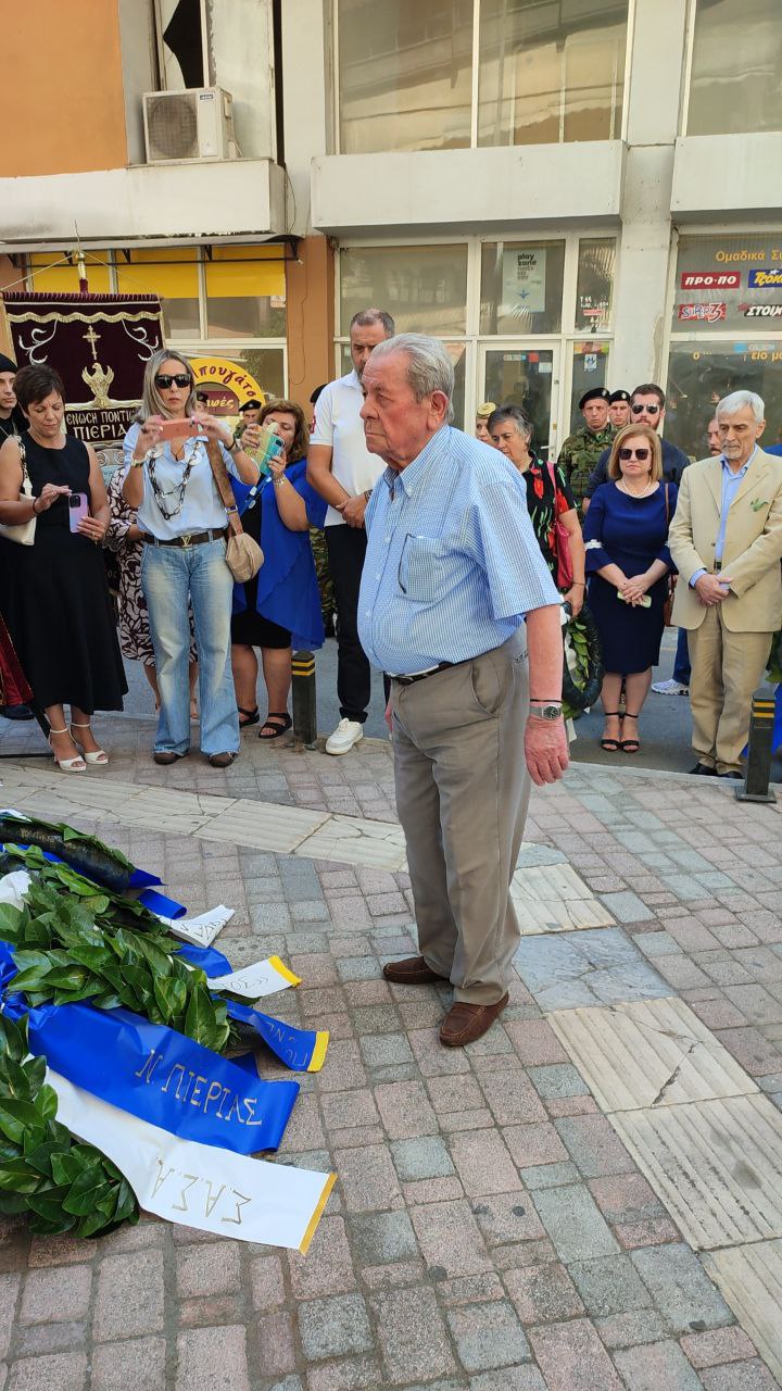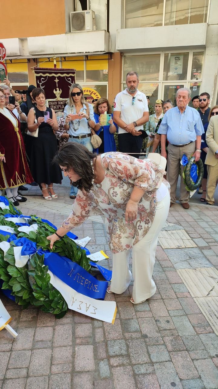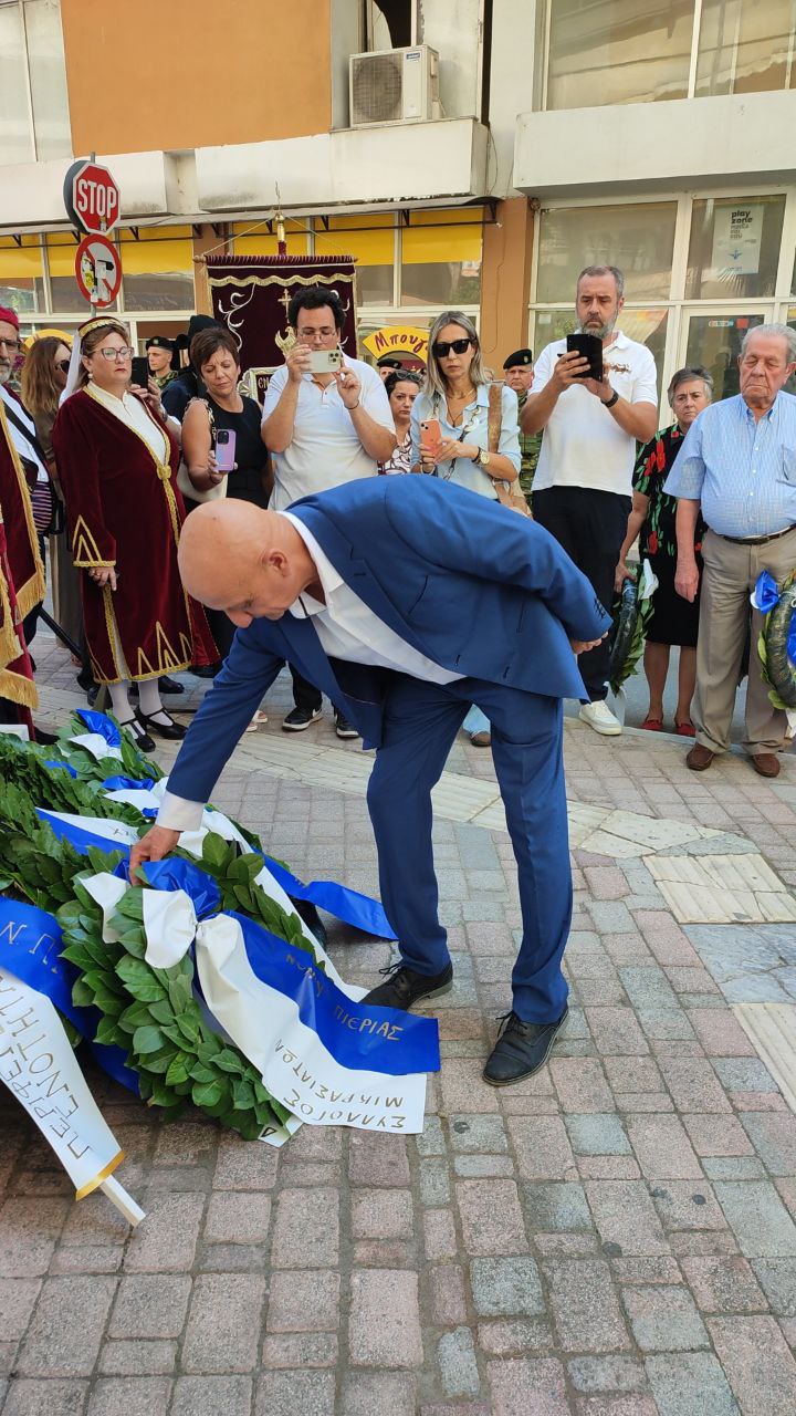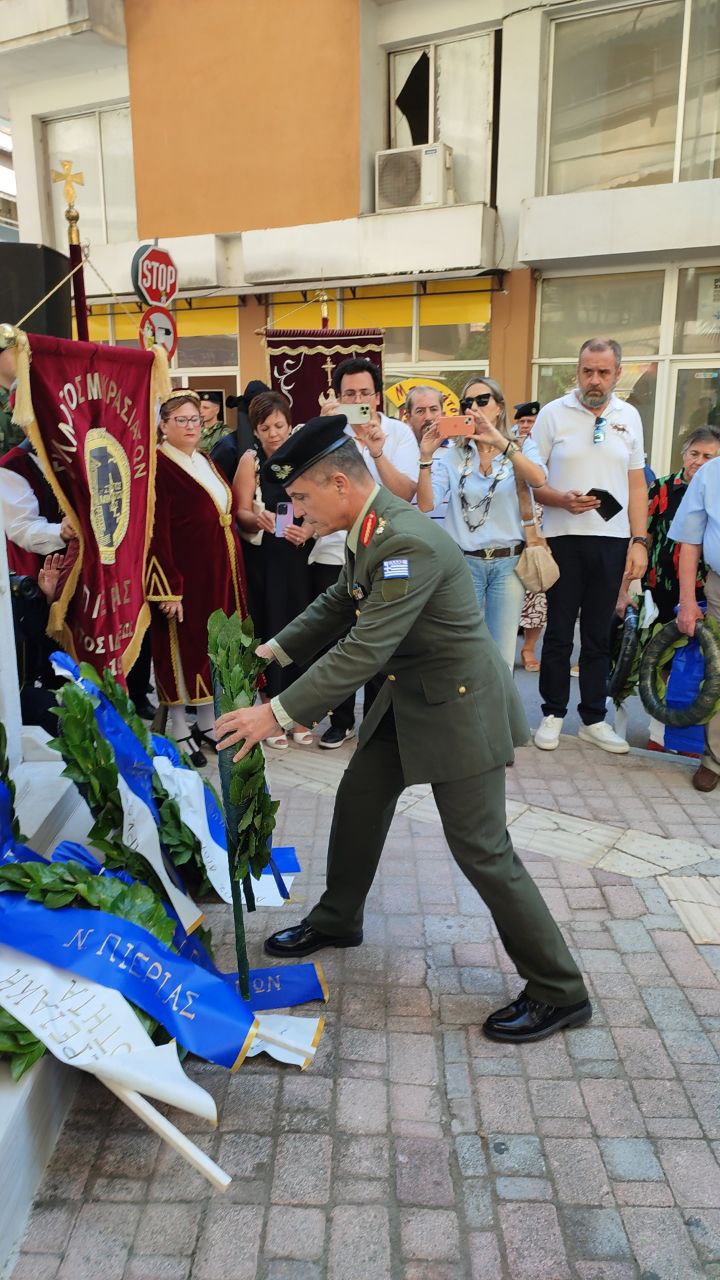 Στεφάνια κατέθεσαν, ο Γενικός Γραμματέας του Υπουργείου Εσωτερικών, Σάββας Χιονίδης, εκπροσωπώντας την κυβέρνηση, ο βουλευτής Πιερίας Σπύρος Κουλκουδίνας, εκπρόσωπος της Βουλής, η Αντιπεριφερειάρχης Πιερίας, Σοφία Μαυρίδου, ο δήμαρχος Κατερίνης, Γιάννης Ντούμος, ο Αθανάσιος Καλαίτζης, εκπρόσωπος του δημάρχου Δίου–Ολύμπου, ο Διοικητής της 24ης Τεθωρακισμένης Ταξιαρχίας Λιτοχώρου, Ταξίαρχος Αθανάσιος Τζήκας, ο Αστυνομικός Υποδιευθυντής Πιερίας, Κωνσταντίνος Παπανικολάου, ο Διοικητής Πυροσβεστικών Υπηρεσιών, Πύραρχος Δημήτριος Κραγιόπουλος, εκπρόσωπος του Λιμεναρχείου Σκάλας Κατερίνης, ο Πρόεδρος του Συλλόγου Μικρασιατών Πιερίας, Αναστάσιος Βογιατζής, ο Σύλλογος Μικρασιατών Νέας Εφέσου «Ο Ηράκλειτος».