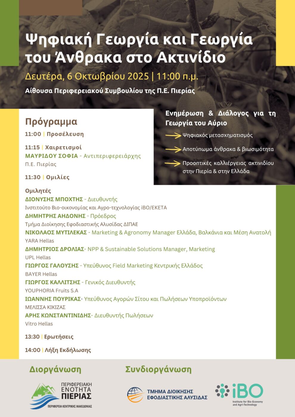 Σας προσκαλούμε στην εκδήλωση με τίτλο «Ψηφιακή Γεωργία και Γεωργία του Άνθρακα στο Ακτινίδιο». Την εκδήλωση διοργανώνει η Περιφερειακή Ενότητα Πιερίας, μαζί με το Ινστιτούτο Βιο-Οικονομίας και Αγρο-Τεχνολογίας του Εθνικού Κέντρου Έρευνας και Τεχνολογικής Ανάπτυξης (iBO/ΕΚΕΤΑ), και το Τμήμα Διοίκησης Εφοδιαστικής Αλυσίδας – Logistics στην Κατερίνη.