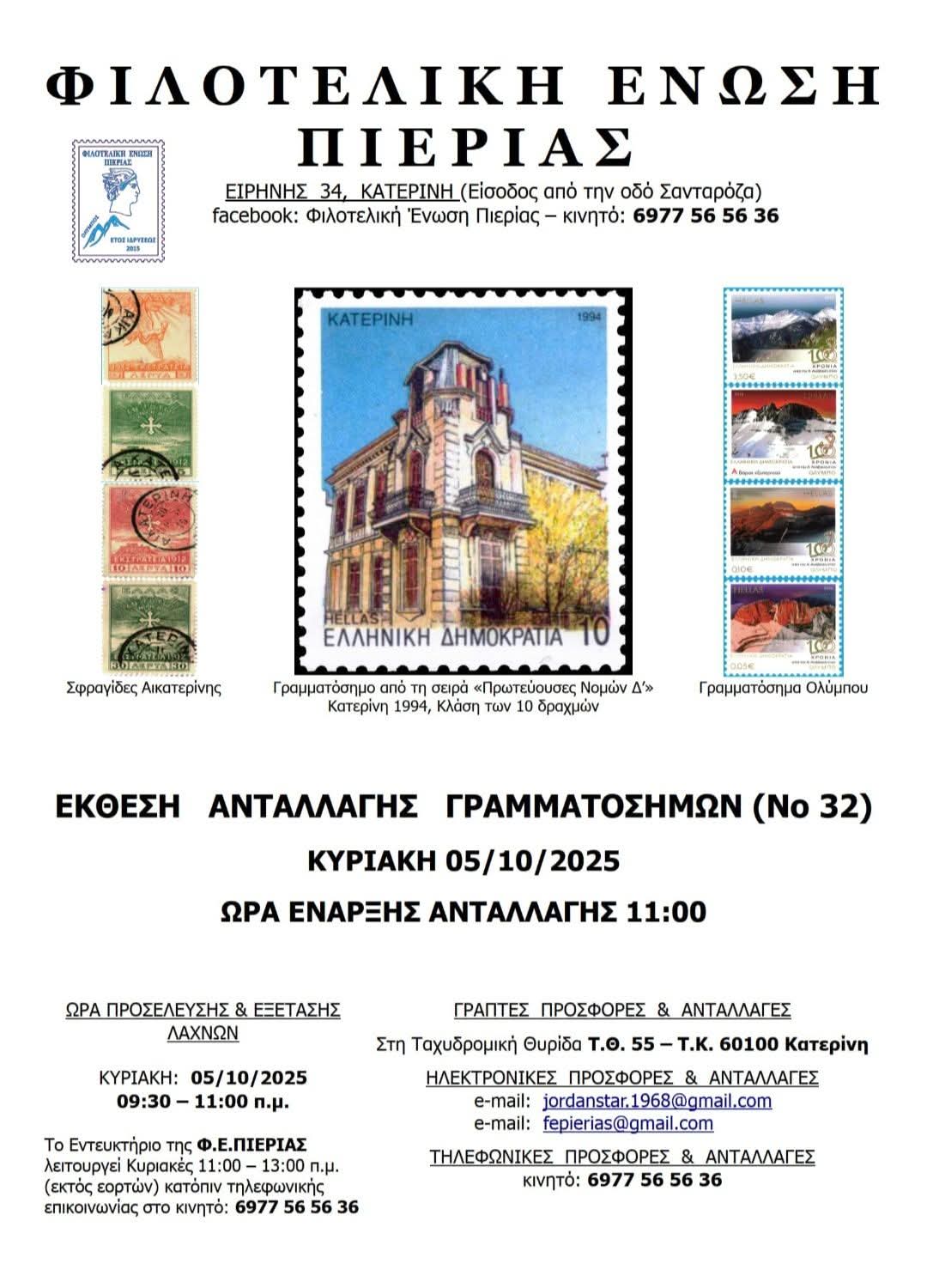 Το Διοικητικό Συμβούλιο της Φιλοτελικής Ένωσης Πιερίας προσκαλεί τα μέλη και τους φίλους να τιμήσουν με την παρουσία τους, την εκδήλωση για την βράβευση του Δήμου Κατερίνης, την κοπή της Τούρτας για τα 10 χρόνια της Φ.Ε. ΠΙΕΡΙΑΣ καθώς και την παρουσία και ομιλία του Προέδρου της Ελληνικής Φιλοτελικής Ομοσπονδίας Χρήστου Γκίκα.