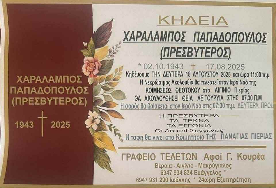 Εκοιμήθη ο Πρεσβύτερος Χαράλαμπος Παπαδόπουλος  σε ηλικία 82 ετών. Η Νεκρώσιμος ακολουθία θα τελεστεί στον Ιερό Ναό της Κοιμήσεως Θεοτόκου στο Αιγίνιο Πιερίας.