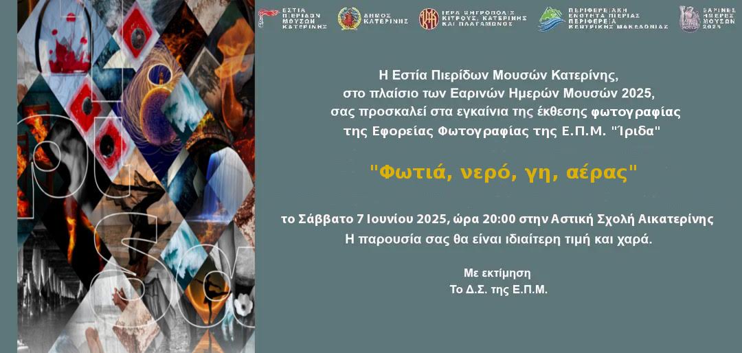 Οι φιλότεχνοι της Κατερίνης και όχι μόνο, καλούνται να επισκεφθούν την έκθεση και να απολαύσουν τις δημιουργίες των φωτογράφων της «Ίριδας», μέσα από ένα θέμα που αποτυπώνει τα τέσσερα βασικά στοιχεία της φύσης.