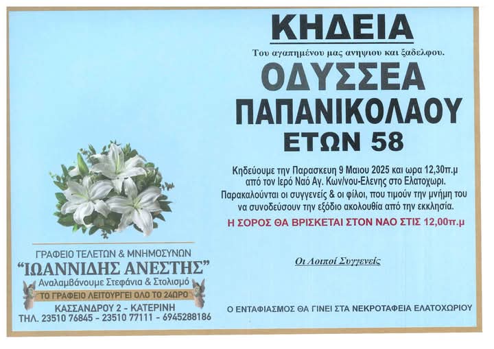 Σε ηλικία 58 ετών απεβίωσε ο Οδυσσέας Παπανικολάου, σκορπώντας τη θλίψη σε συγγενείς, γνωστούς και φίλους. Η κηδεία του θα γίνει αύριο, Παρασκευή 9 Μαϊου και ώρα 12:30 το μεσημέρι. Η νεκρώσιμος ακολουθία θα τελεστεί στον Ιερό Ναό Αγίων Κωνσταντίνου και Ελένης στο Ελατοχώρι.