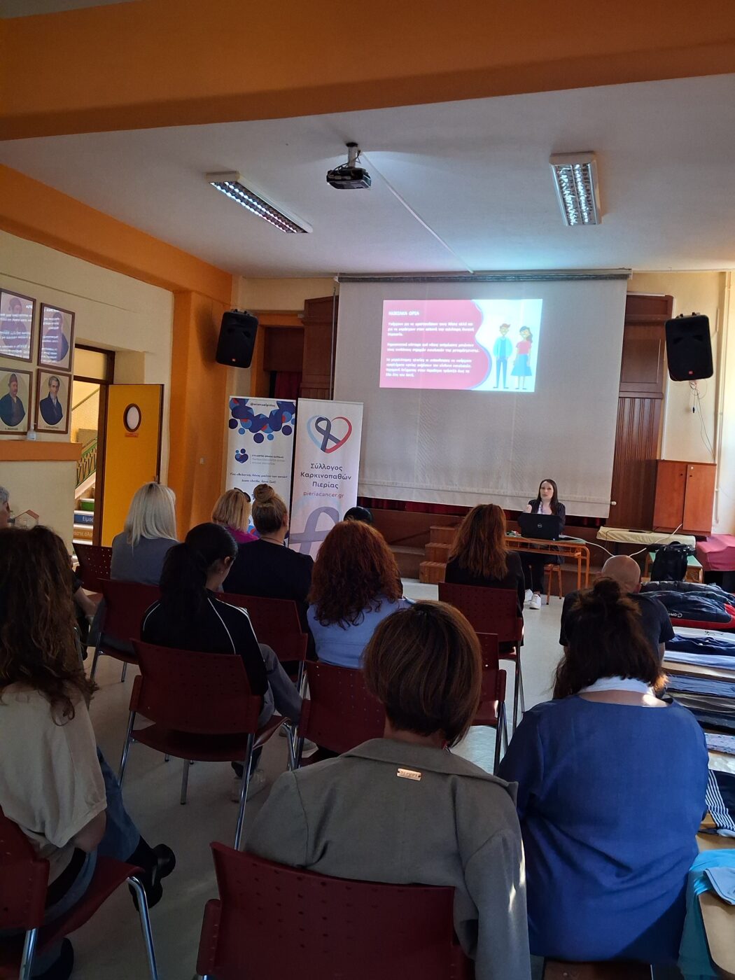 Η πρόεδρος του Συλλόγου Καρκινοπαθών Πιερίας κα Ράνια Καραμήτσιου ενημέρωσε πλήρως τους παρευρισκομένους, αναδεικνύοντας την κρίσιμη σημασία της εθελοντικής προσφοράς για τους συνανθρώπους μας που το έχουν ανάγκη.