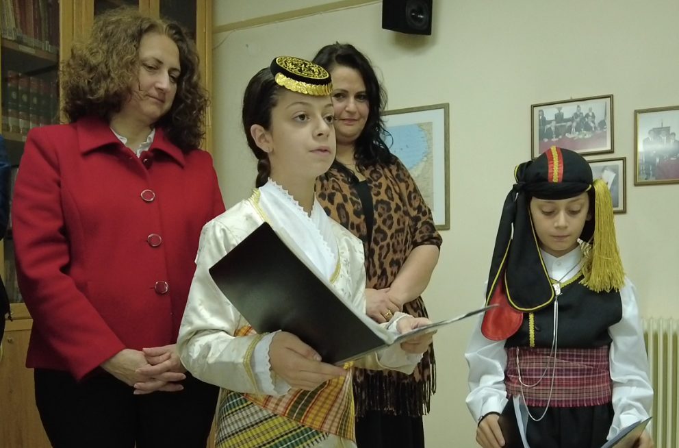 Στη συνέχεια ο Β’ Αντιπρόεδρος του συλλόγου ο κ. Μίμης Συμεωνίδης έκανε αναφορά και αναπαράσταση στο παραδοσιακό έθιμο του Πόντου, το «Καλαντίασμα», με τη συμμετοχή των παιδιών.