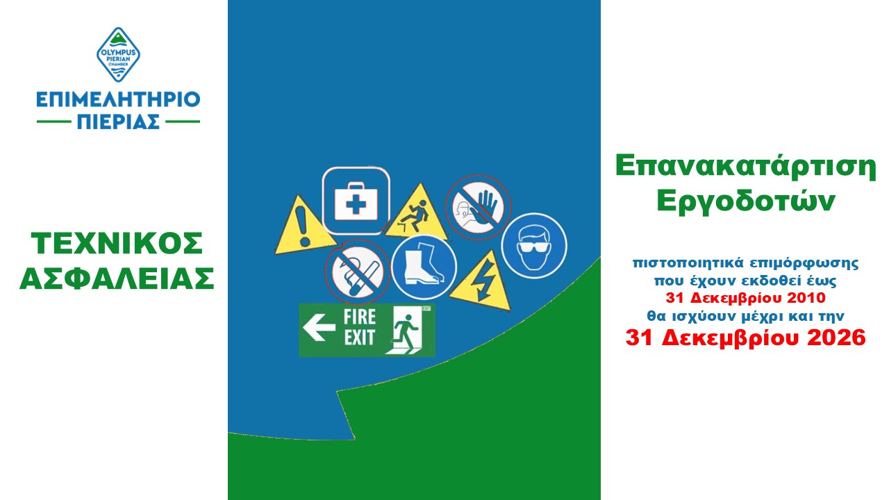 Επιμελητήριο Πιερίας: Επανακατάρτιση εργοδοτών επιχειρήσεων για ανανέωση πιστοποιητικών επιμόρφωσης τεχνικού ασφαλείας