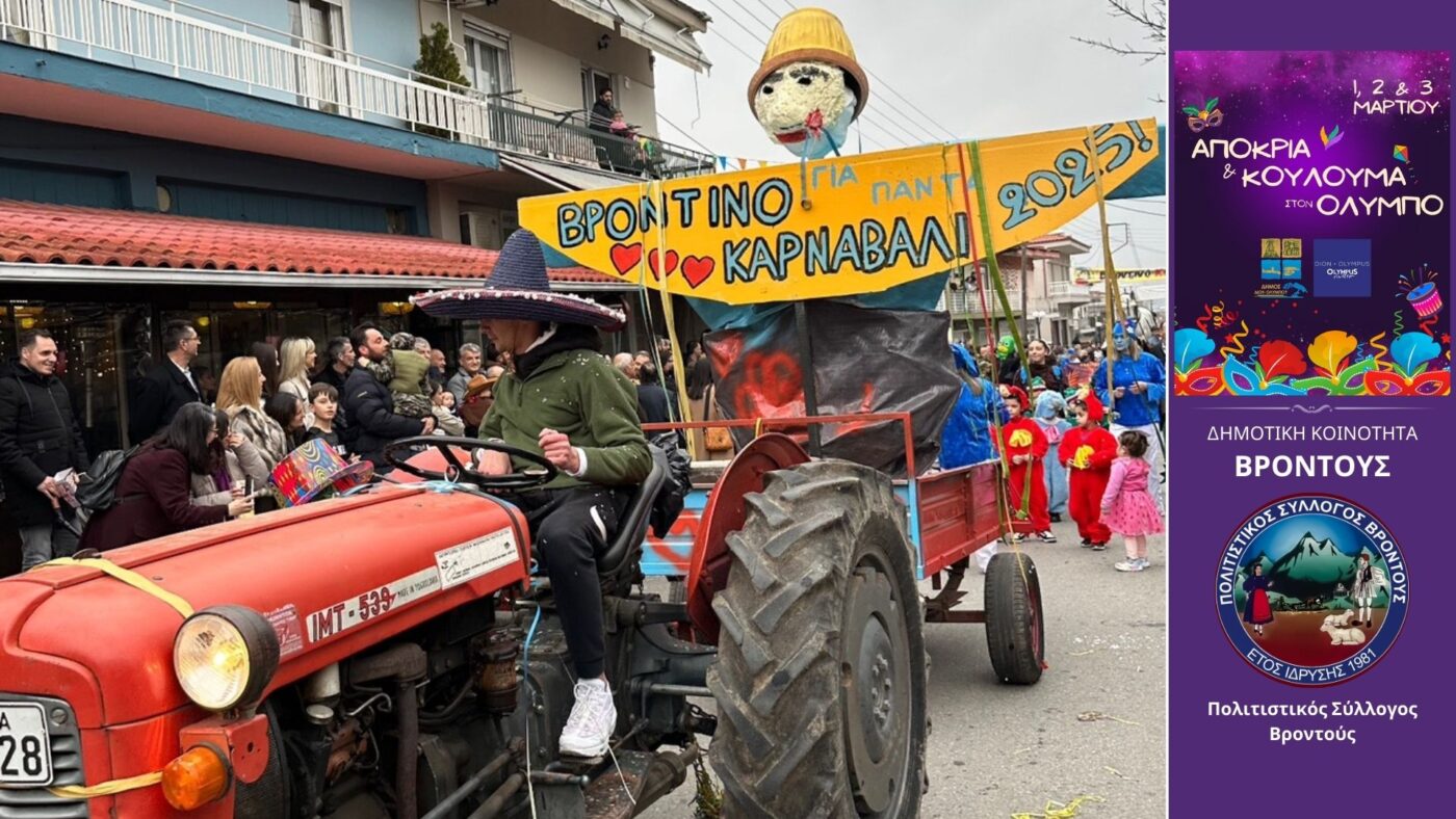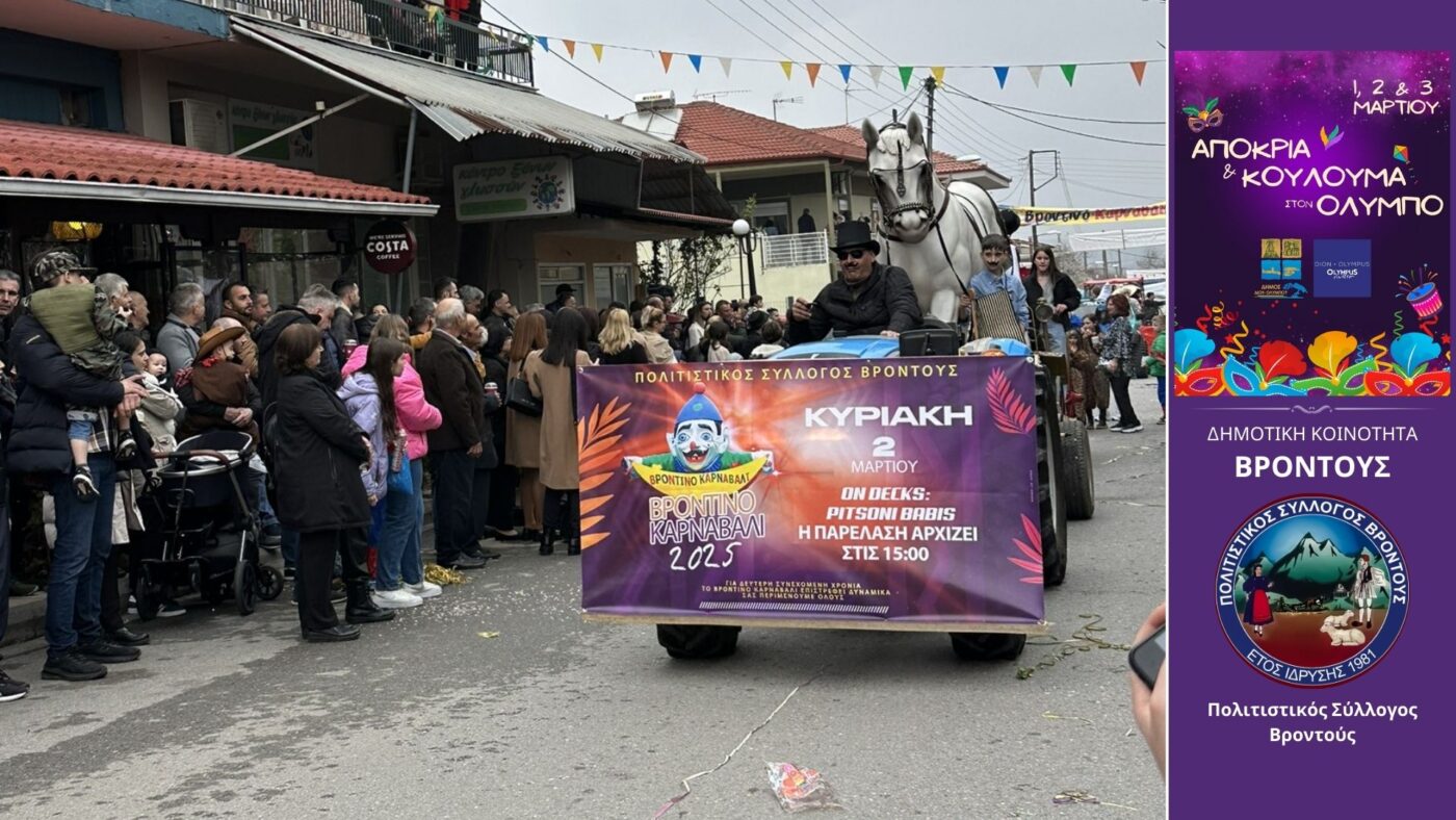 Ολοκληρώθηκαν με επιτυχία το τριήμερο 1-3 Μαρτίου 2025 οι εκδηλώσεις για τον εορτασμό της Αποκριάς και της Καθαρά Δευτέρας στον Δήμο Δίου-Ολύμπου. Μουσική, χορός, αποκριάτικα πάρτι για μικρούς και μεγάλους, παρελάσεις αρμάτων, αναβίωση παραδοσιακών εθίμων και γεύσεις σαρακοστιανών συνέθεσαν εορταστικό τριήμερο, που παρακολούθησε πλήθος κόσμου, παρά τις άστατες καιρικές συνθήκες.