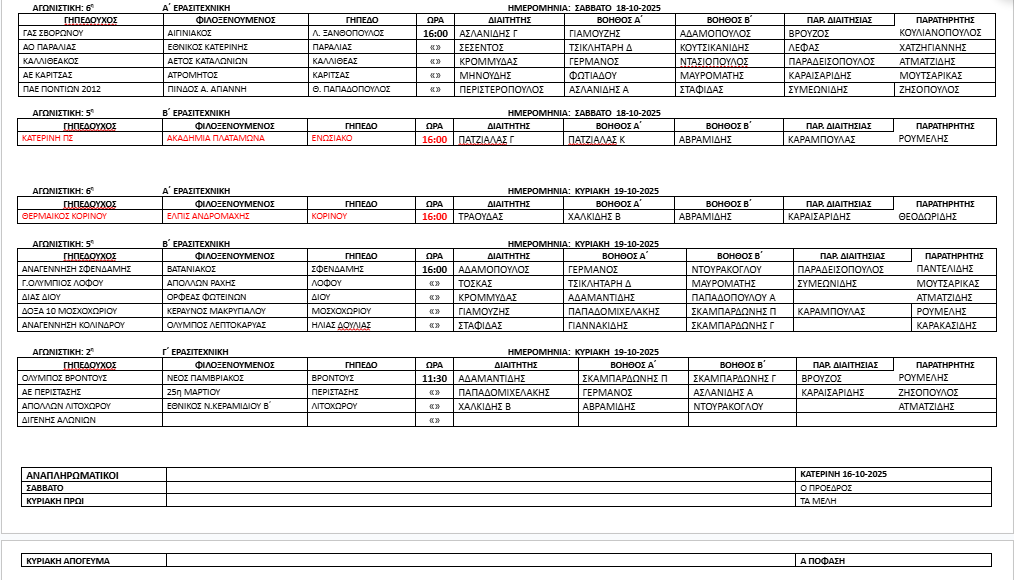 Στην Νέα Έφεσο και στα γραφεία της Ε.Π.Σ. Πιερίας σήμερα 16-10-2025 ημέρα Πέμπτη και ώρα 15:00 συνήλθε σε συνεδρίαση η Επιτροπή Διαιτησίας της Ε.Π.Σ. Πιερίας που αποτελείται από τους Καραισαριδη Νικόλαο Πρόεδρο, Συμεωνίδη Παναγιώτη Αναπληρωτή Πρόεδρο και τα μέλη Βρούζο Κωνσταντίνο, με θέμα τον ορισμό διαιτητών και βοηθών διαιτητού για τους αγώνες πρωταθλήματος της Ε.Π.Σ. Πιερίας που θα πραγματοποιηθούν την 18 & 19-10-2025. Μετά από διαλογική συζήτηση αποφασίσθηκε ομόφωνα ο ορισμός των διαιτητών και βοηθών διαιτητού όπως αναγράφεται παρακάτω.