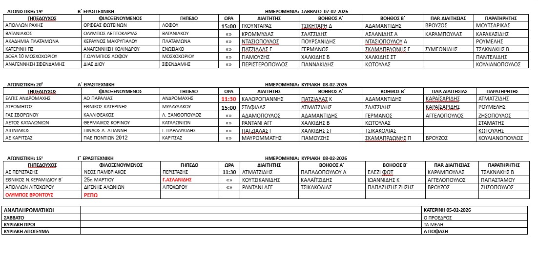 Στην Νέα Έφεσο και στα γραφεία της Ε.Π.Σ. Πιερίας 05-02-2026 ημέρα Πέμπτη και ώρα 15:00 συνήλθε σε συνεδρίαση η Επιτροπή Διαιτησίας της Ε.Π.Σ. Πιερίας που αποτελείται από τους Καραισαριδη Νικόλαο Πρόεδρο, Συμεωνίδη Παναγιώτη Αναπληρωτή Πρόεδρο και  τα μέλη Βρούζο Κωνσταντίνο, με θέμα τον ορισμό διαιτητών και βοηθών διαιτητού για τους αγώνες πρωταθλήματος  της Ε.Π.Σ. Πιερίας που θα πραγματοποιηθούν  την 07 & 08-02-2026.  Μετά από διαλογική συζήτηση αποφασίσθηκε ομόφωνα ο ορισμός των διαιτητών και βοηθών διαιτητού όπως αναγράφεται παρακάτω.