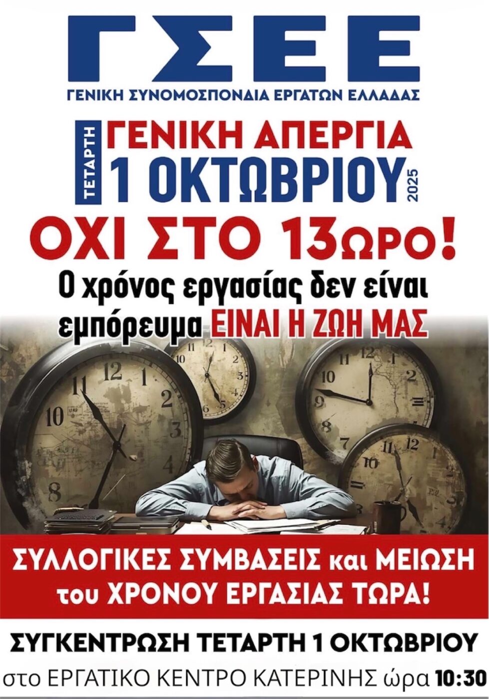 ΟΛΕΣ & ΟΛΟΙ ΣΤΗΝ ΑΠΕΡΓΙΑ ΚΑΙ ΣΤΗΝ ΑΠΕΡΓΙΑΚΗ ΣΥΓΚΕΝΤΡΩΣΗ ΣΤΟ ΕΡΓΑΤΙΚΟ ΚΕΝΤΡΟ ΚΑΤΕΡΙΝΗΣ την ΤΕΤΑΡΤΗ 1 Οκτωβρίου 2025 στις 10:30 το πρωί!