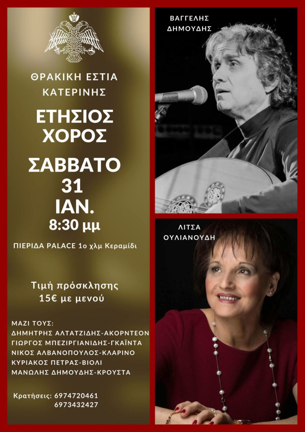 Σας προσκαλούμε στο Αυθεντικό Θρακιώτικο Γλέντι με τους Βαγγέλη Δημούδη και την Λίτσα Ουλιανούδη, που θα πραγματοποιηθεί το Σάββατο 31 Ιανουαρίου 2026 στην Pierida Palace.