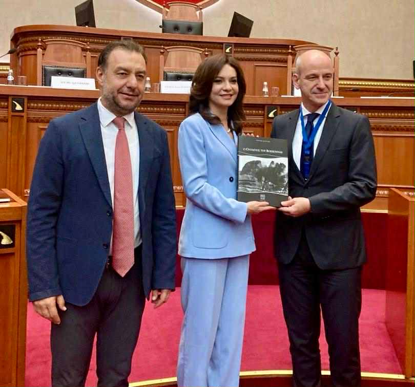 Ο Βουλευτής Πιερίας στην λήξη των εργασιών της Συνέλευσης προσέφερε στην Πρόεδρο του Αλβανικού Κοινοβουλίου, κα Eliza Spyropali, το βιβλίο «Ο Όλυμπος του Boissonnas», έκδοση του Δήμου Δίου Ολύμπου, που περιλαμβάνει τις πρώτες φωτογραφίες του Ελβετού φωτογράφου Frédéric Boissonnas από το 1913, αποτυπώνοντας τις κορυφές του Ολύμπου και το Λιτόχωρο.